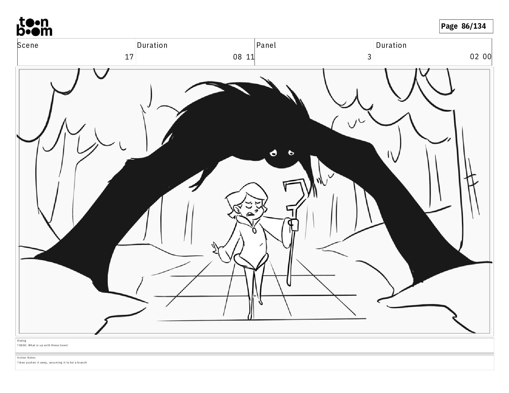 02 00 D i a l o g T I B O O : W h a t i s u p w i t h t h e s e t r e e s ! A c t i o n N o t e s T i b o o p u s h e s i t a w a y , a s s u m i n g i t t o b e a b r a n c h