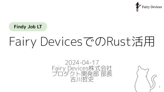 Fairy DevicesでのRust活用 2024-04-17 Fairy Devices株式会社 プロダクト開発部 部長 吉川哲史 Findy Job