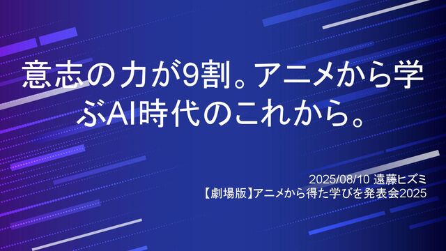 10年前に予想されたAIに代替される仕事が大はずれし、人に出来ることを凄い勢い代替していくAI そんな道具がある時代にこそ、やりたい意志こそが大事だと思っています。 いくつかのアニメを挙げて、意志が大事と言うことを話したいと思います。