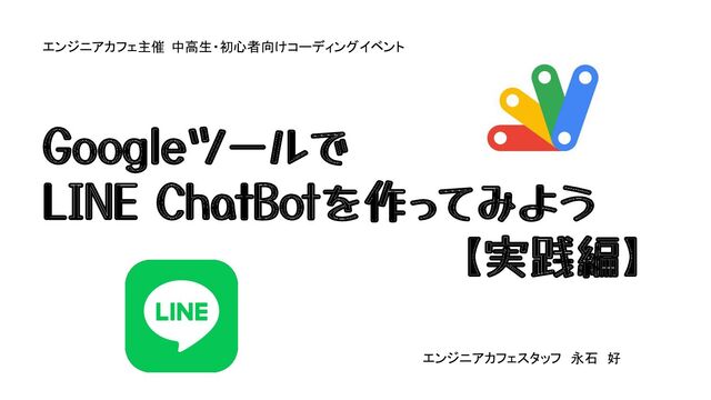 GoogleツールでLINEBotを作ってみよう~実践編~で使用したスライド資料です。 YouTubeに当日のイベントの様子もありますので、併せてご利用ください。 https://www.youtube.com/watch?v=LkiEMOQi0Y4