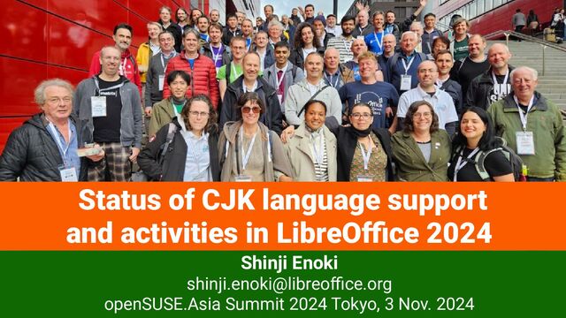 Team(2011-) • Membership Committee Deputies of The Document Foundation(2020-) • LibreOffice Activity: Organizing JA events, support JA communitiy, sometimes Ask, translation and QA • Member of openSUSE.Asia Summit 2024 Tokyo local team • Other communities: – Volunteer staff of Japan UNIX Society (2011-), Volunteer staff of KANSAI OPEN SOURCE (2006-), Nextcloud JP community, OpenData project(e.g. OpenStreetMap), etc.