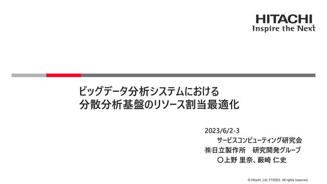 © Hitachi, Ltd. FY2023. All rights reserved. ビッグデータ分析システムにおける 分散分析基盤のリソース割当最適化 2023/6/2-3