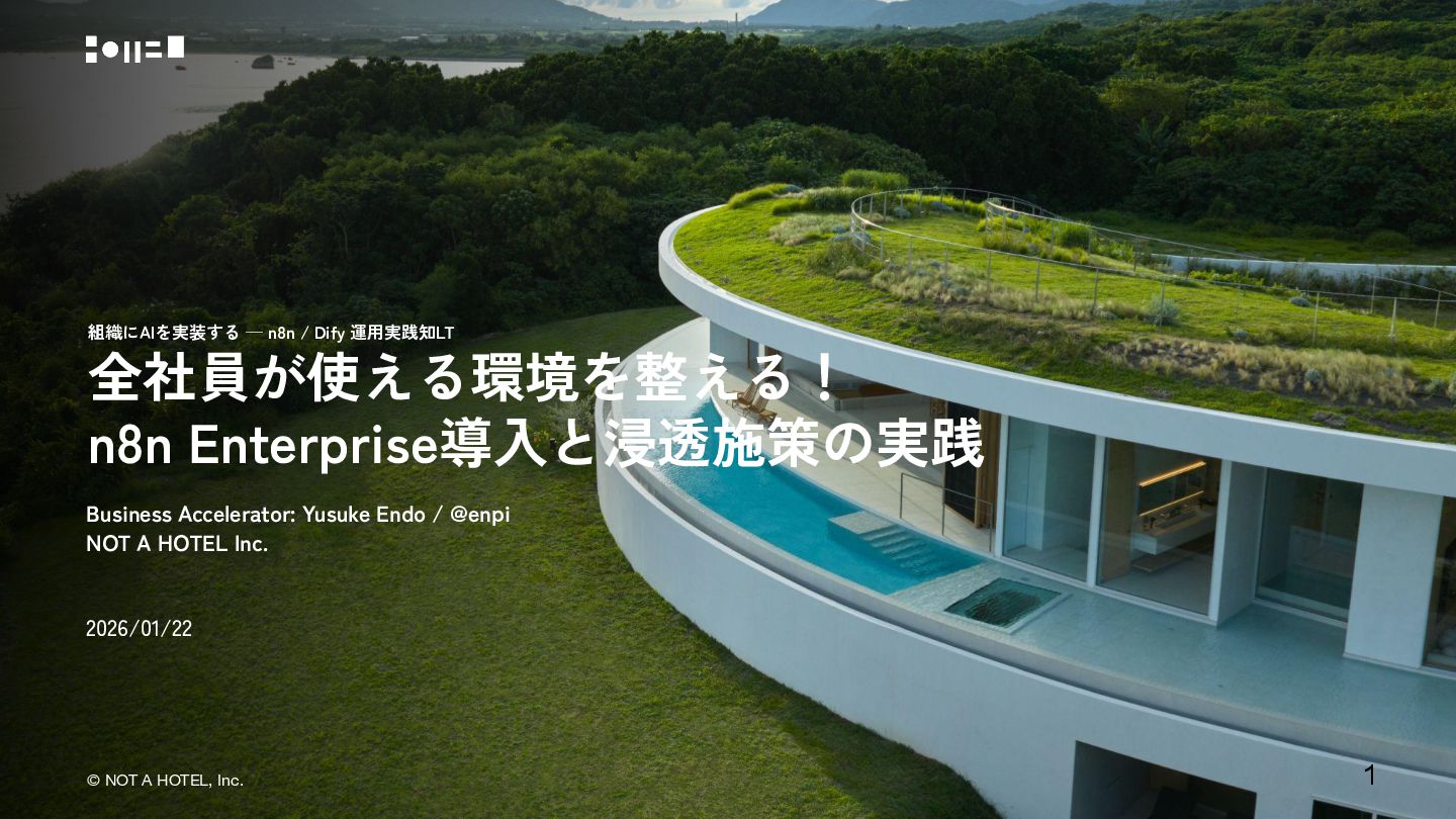 全社員が使える環境を整える! n8n Enterprise導入と浸透施策の実践 組織に AIを 実装する ─ n8n / Dify 運用実践知LT 1 Business Accelerator: Yusuke Endo / @enpi NOT A HOTEL Inc. 2026/01/22