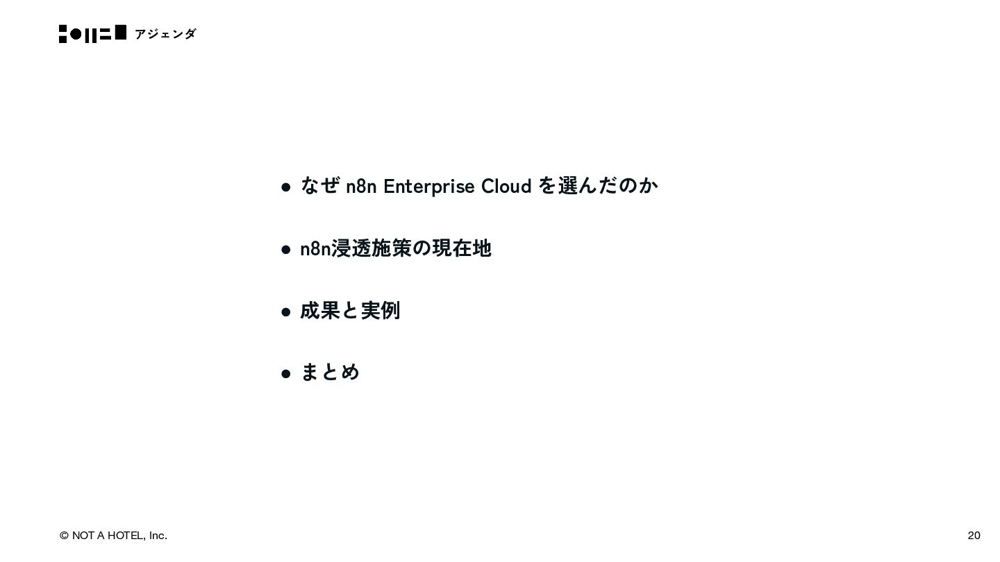 を選んだのか • n8n浸透施策の現在地 • 成果と実例 • まとめ アジェンダ 20