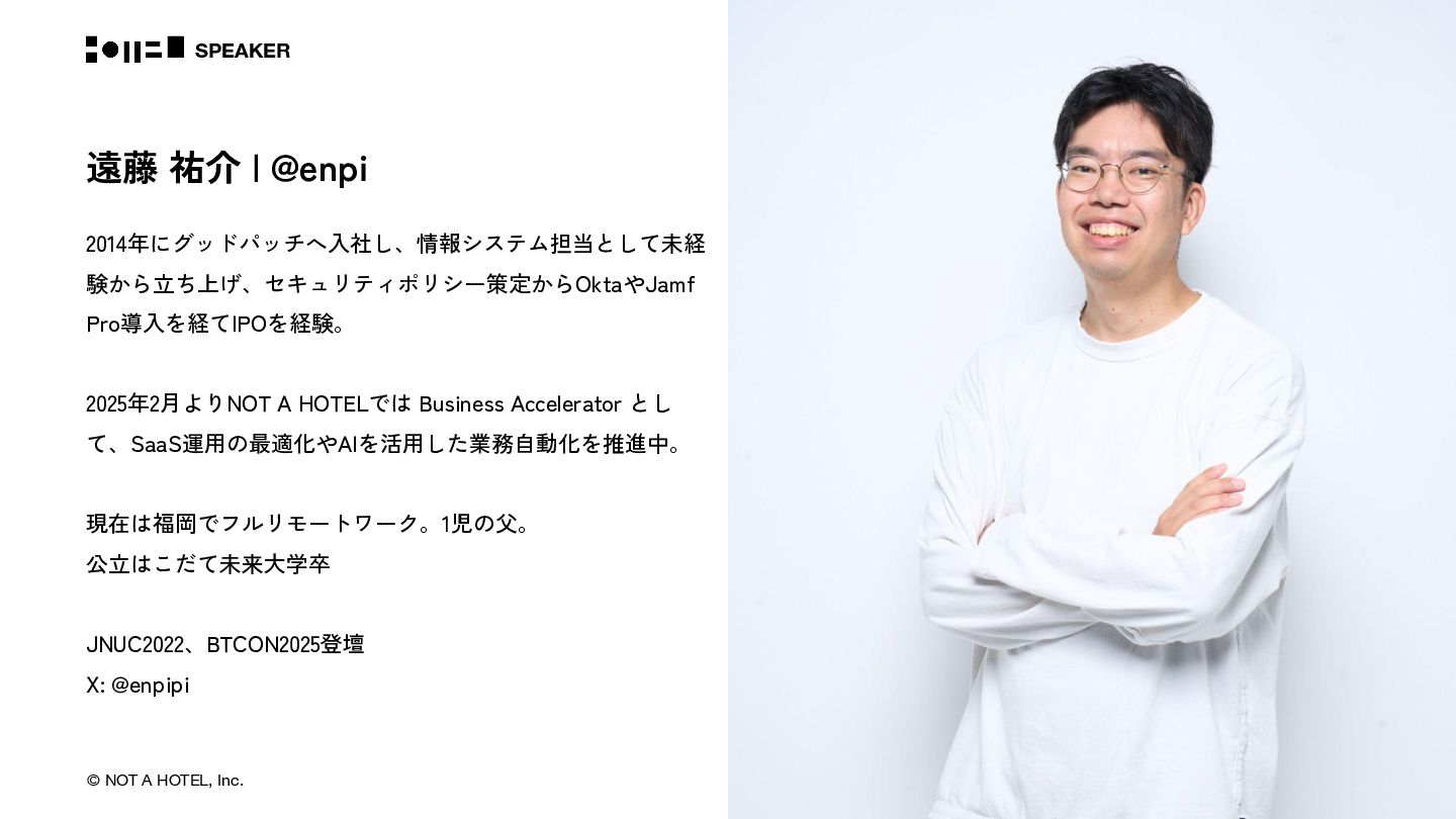 @enpi 2014年にグッドパッチへ入社し、情報システム担当として未経 験から立ち上げ、セキュリティポリシー策定からOktaやJamf Pro導入を経てIPOを経験。 2025年2月よりNOT A HOTELでは Business Accelerator とし て、SaaS運用の最適化やAIを活用した業務自動化を推進中。 現在は福岡でフルリモートワーク。1児の父。 公立はこだて未来大学卒 JNUC2022、BTCON2025登壇 X: @enpipi