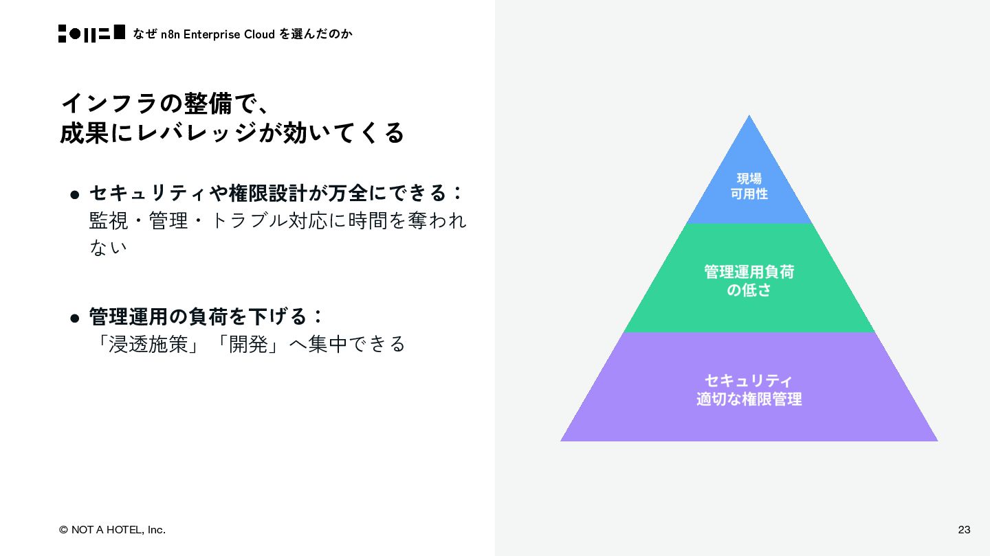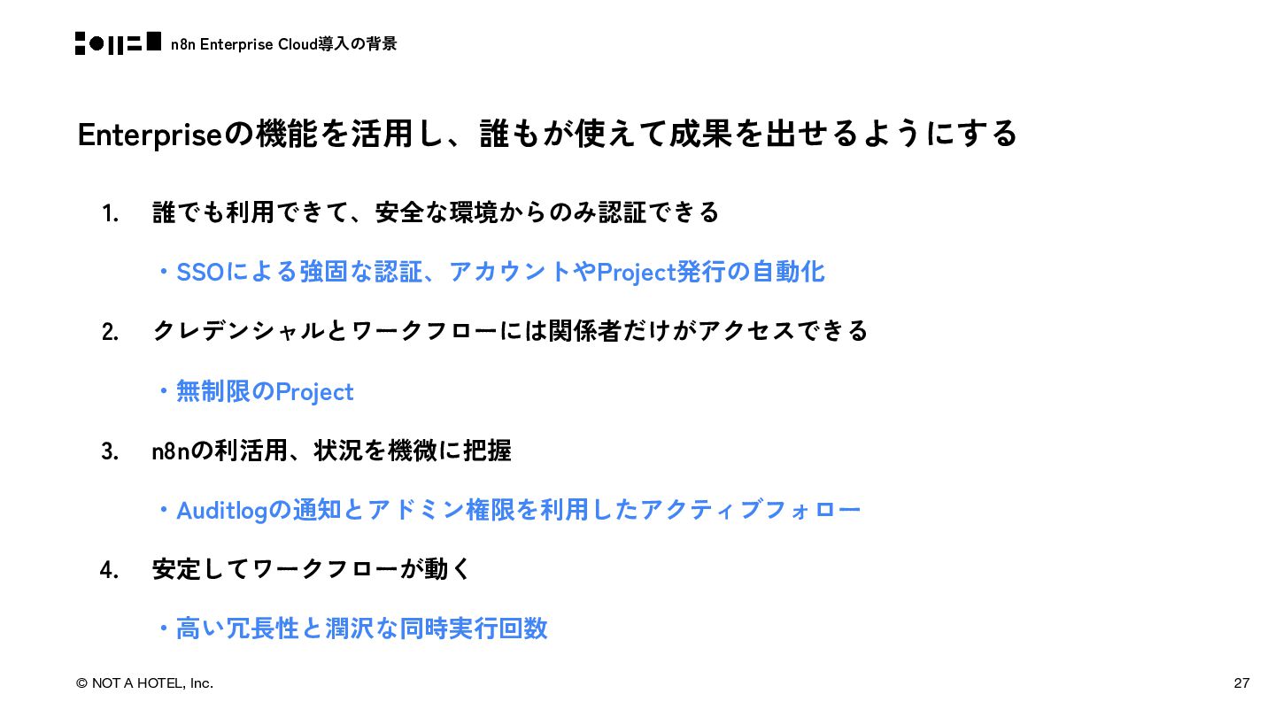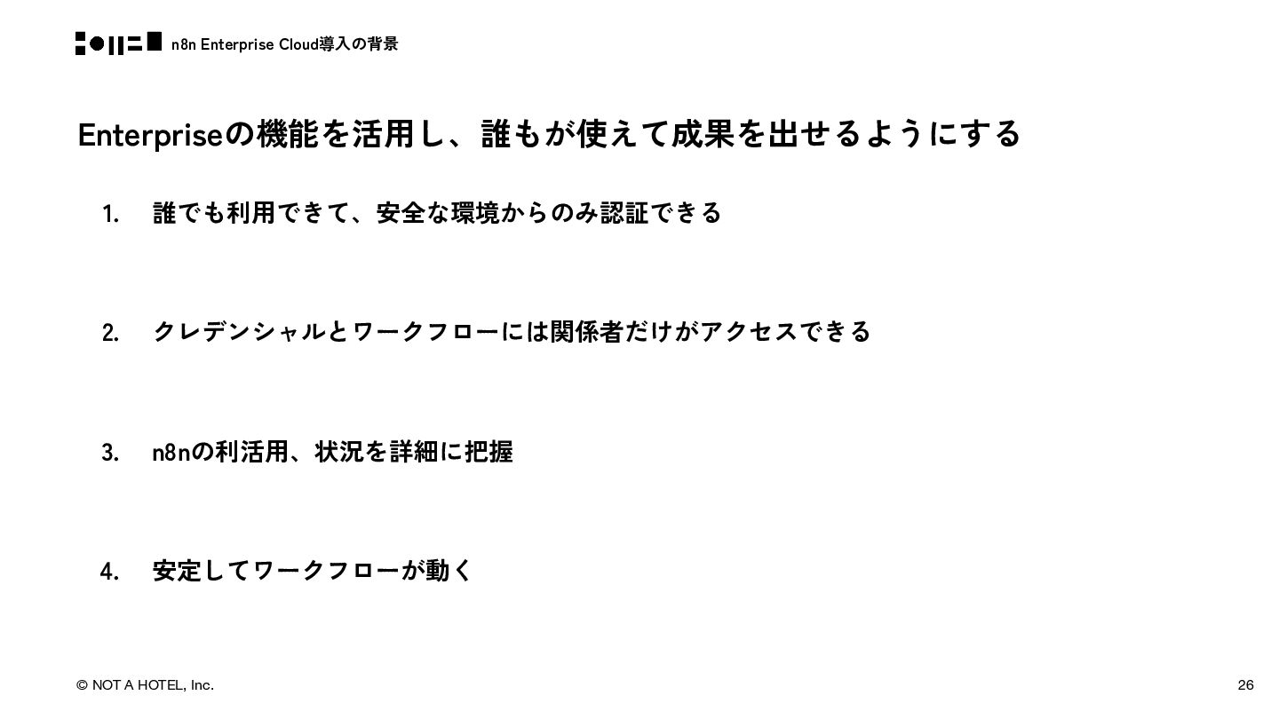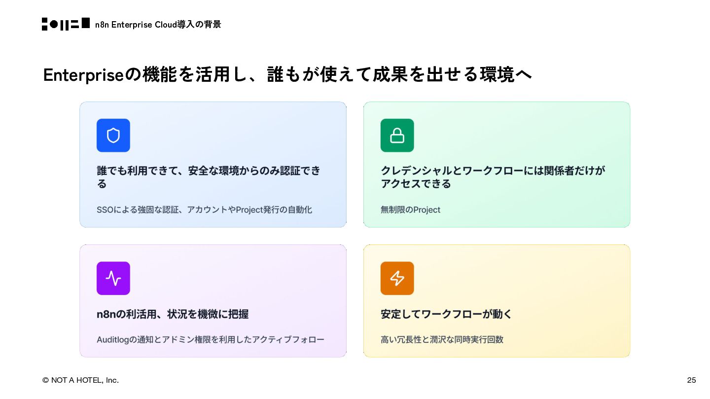 © NOT A HOTEL, Inc. n8n Enterprise Cloud導入の背景 25 Enterpriseの機能を活用し、誰もが使えて成果を出せる環境へ