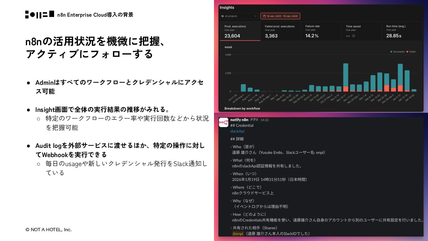 © NOT A HOTEL, Inc. n8n Enterprise Cloud導入の背景 28 n8nの活用状況を機微に把握、