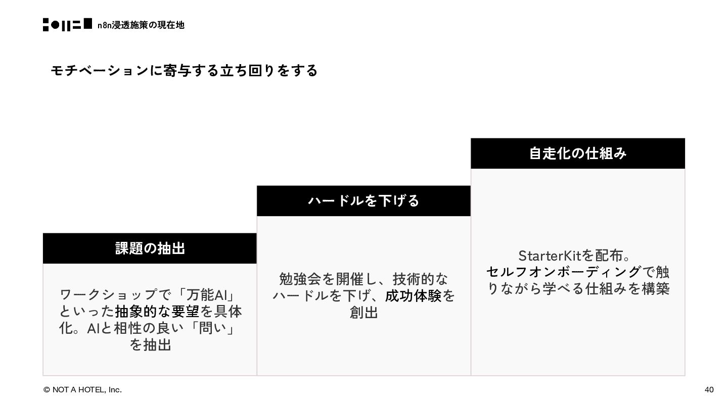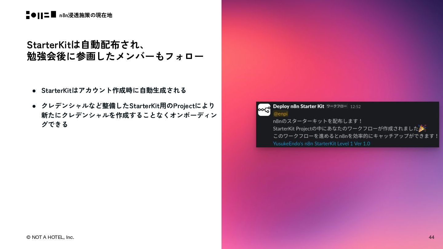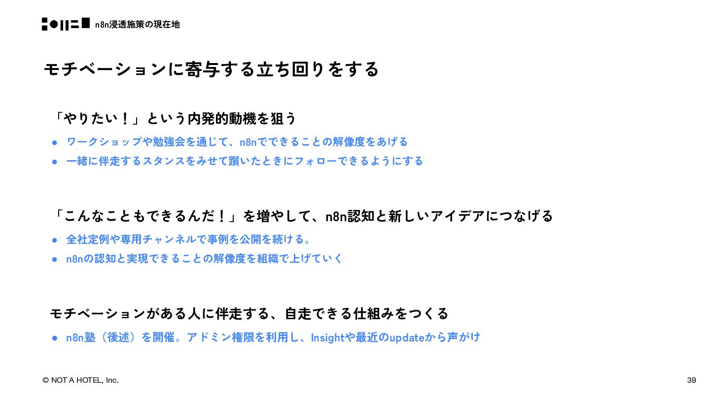 © NOT A HOTEL, Inc. n8n浸透施策の現在地 38 StarterKitを用いた勉強会を開催 ハードルを下げる、モチベーションがある人が自走できる状態へ