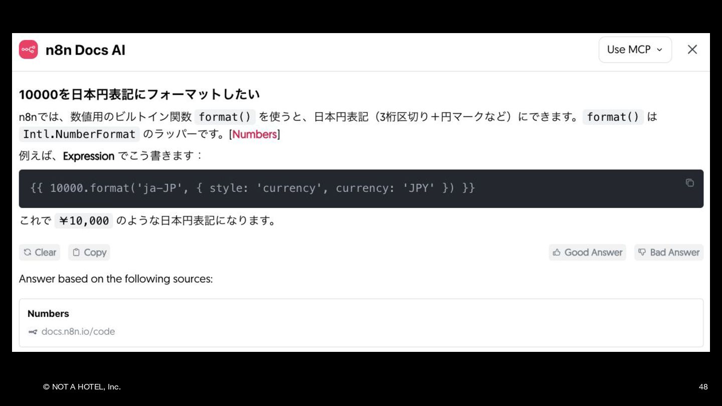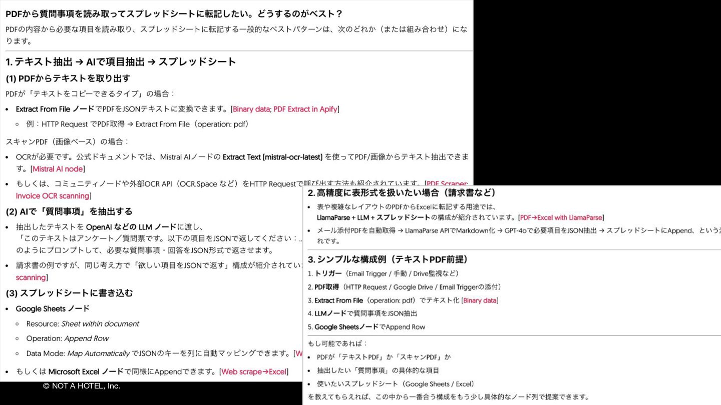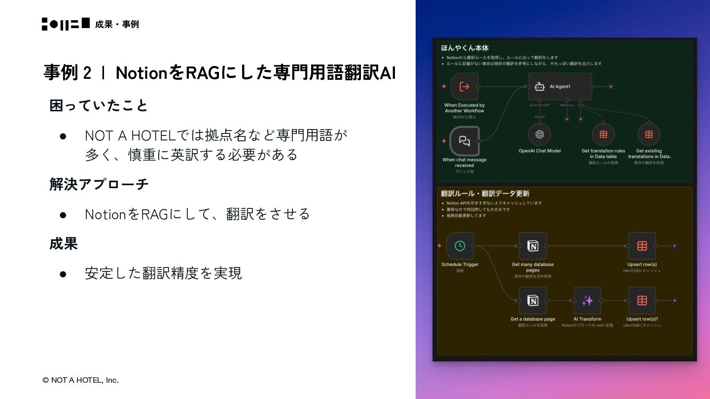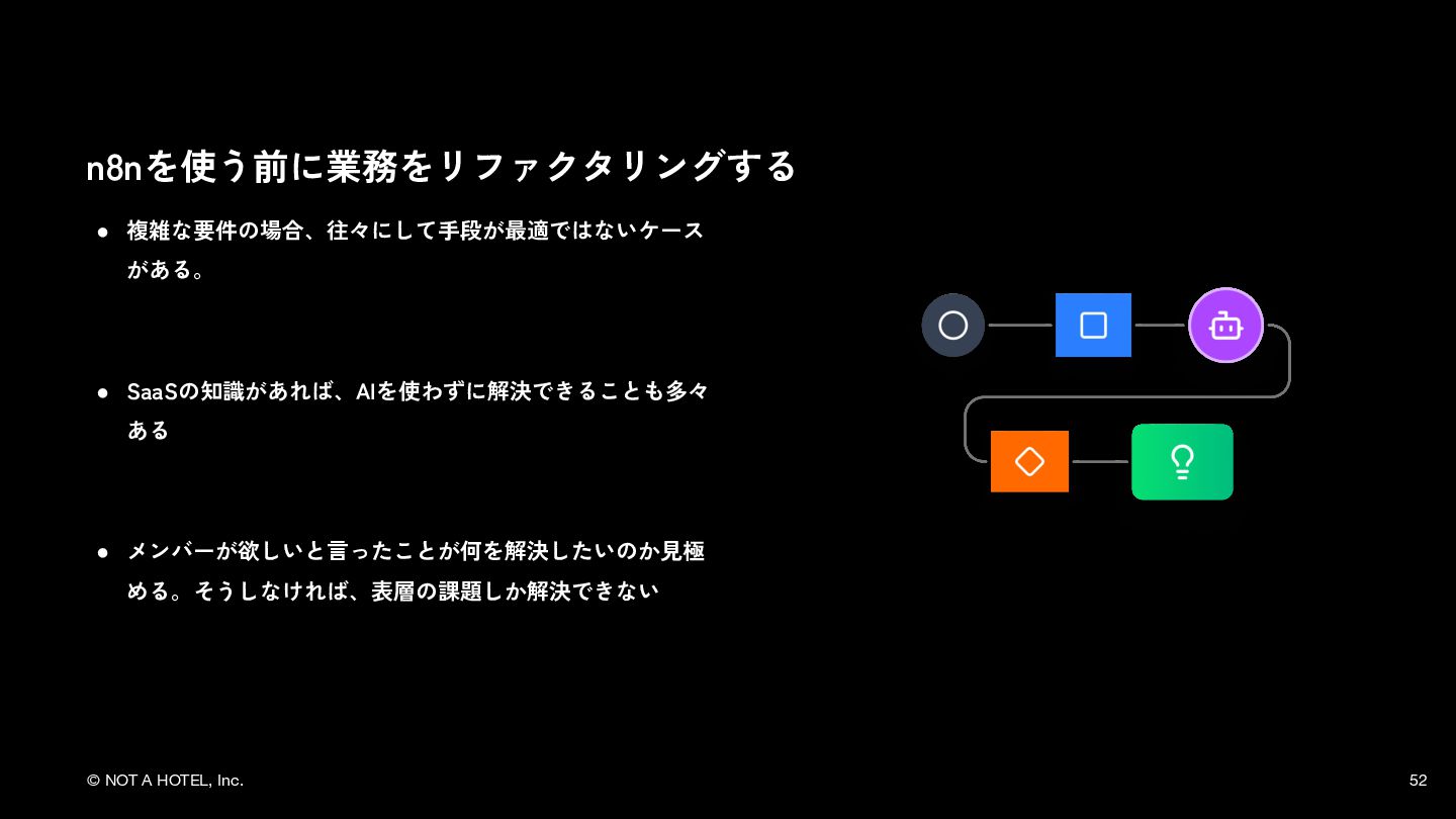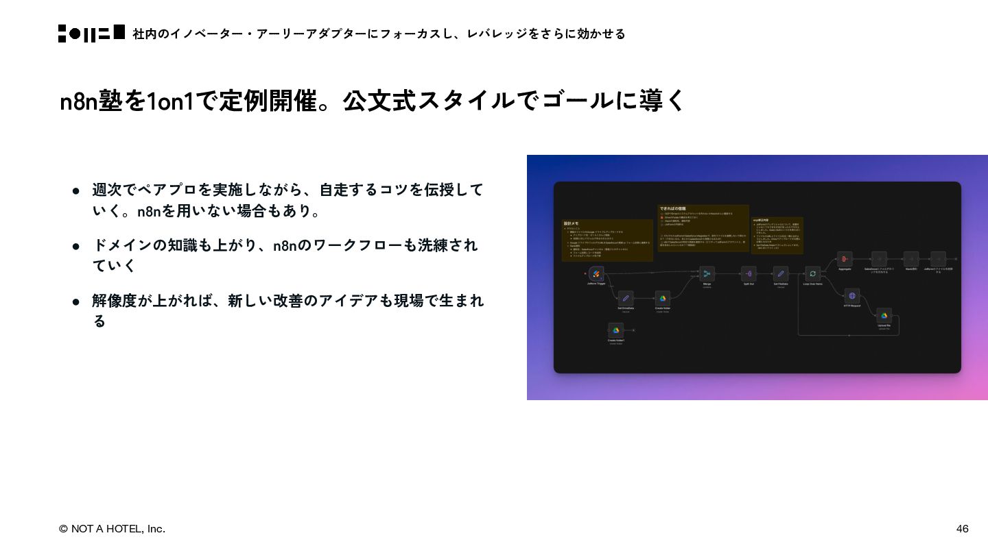 © NOT A HOTEL, Inc. • 週次でペアプロを実施しながら、自走するコツを伝授して いく。n8nを用いない場合もあり。 • ドメインの知識も上がり、n8nのワークフローも洗練され