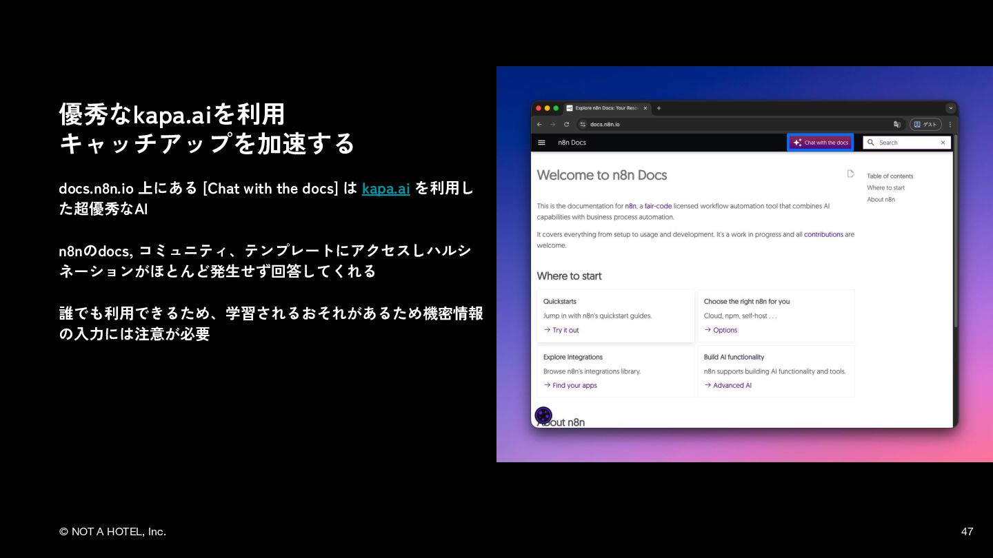 docs.n8n.io 上にある [Chat with the docs] は kapa.ai を利用し た超優秀なAI n8nのdocs, コミュニティ、テンプレートにアクセスしハルシ ネーションがほとんど発生せず回答してくれる 誰でも利用できるため、学習されるおそれがあるため機密情報 の入力には注意が必要 43 優秀なkapa.aiを利用 キャッチアップを加速する