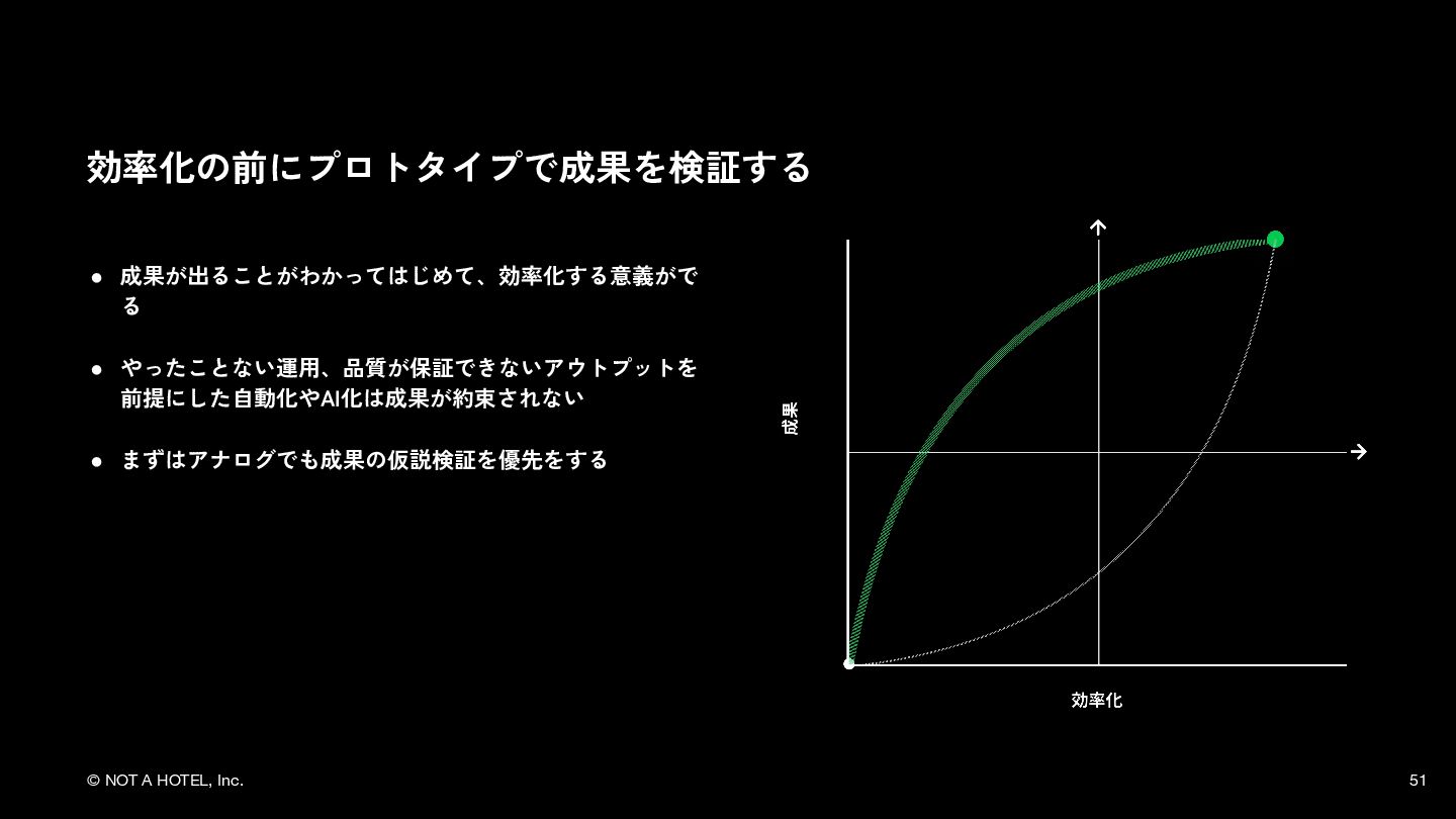 47 効率化の前にプロトタイプで成果を検証する • 成果が出ることがわかってはじめて、効率化する意義がで る • やったことない運用、品質が保証できないアウトプットを 前提にした自動化やAI化は成果が約束されない • まずはアナログでも成果の仮説検証を優先をする