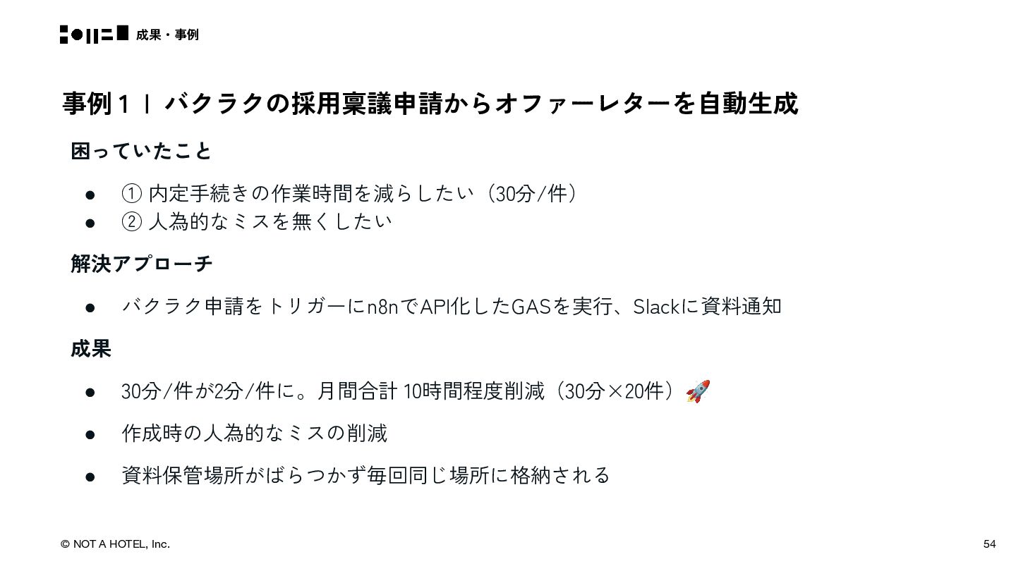 ② 人為的なミスを無くしたい 解決アプローチ • バクラク申請をトリガーにn8nでAPI化したGASを実行、Slackに資料通知 成果 • 30分/件が2分/件に。月間合計 10時間程度削減(30分×20件)🚀 • 作成時の人為的なミスの削減 • 資料保管場所がばらつかず毎回同じ場所に格納される 成果・事例 50 事例 1 | バクラクの採用稟議申請からオファーレターを自動生成