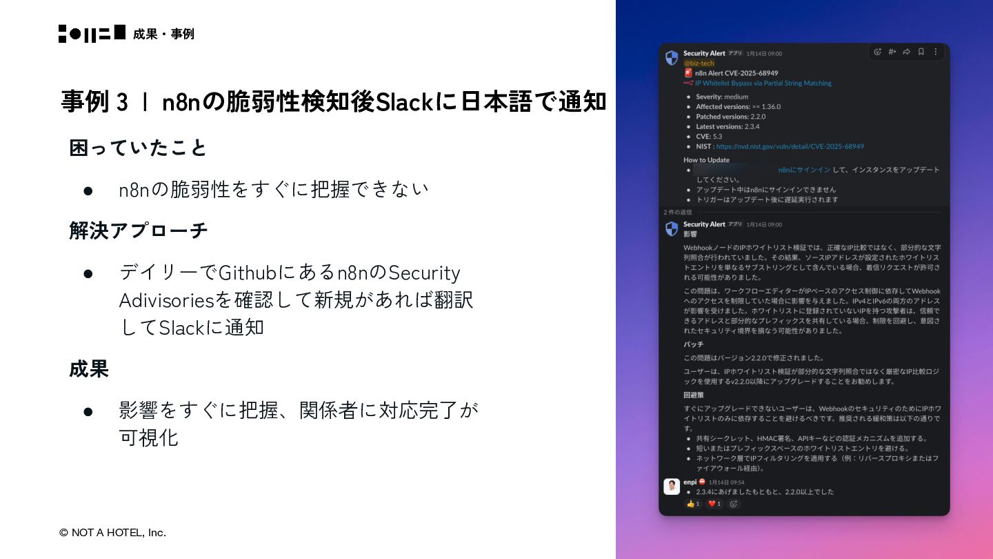 © NOT A HOTEL, Inc. 困っていたこと • n8nの脆弱性をすぐに把握できない 解決アプローチ •