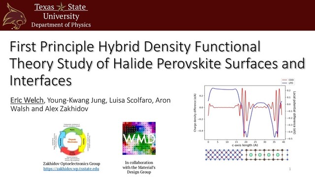 Surfaces and Interfaces Eric Welch, Young-Kwang Jung, Luisa Scolfaro, Aron Walsh and Alex Zakhidov Texas State University Department of Physics Zakhidov Optoelectronics Group https://zakhidov.wp.txstate.edu In collaboration with the Material’s Design Group 1