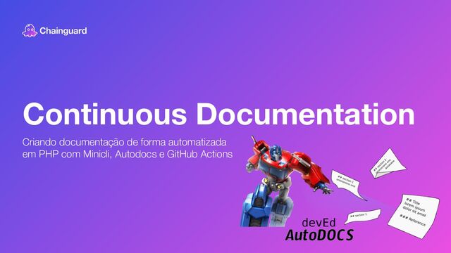 Adicionar erikaheidi/autodocs como dependência 3. Configurar Autodocs e definir onde fazer output, onde buscar por JSONs, templates, etc 4. Registrar o serviço Autodocs 5. Criar um comando para fazer build dos arquivos markdown 6. Criar uma ou mais classes para representar cada página da documentação. Opcionalmente, usar JSON feeds e templates 7. Rodar o comando de build e ver o resultado =) TL;DR para esse tutorial