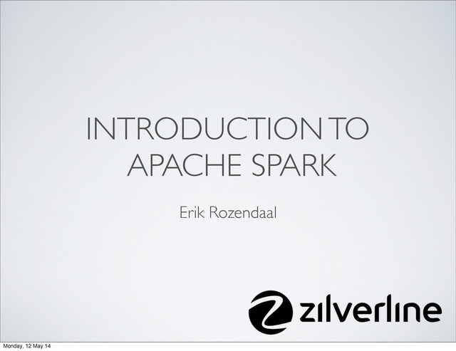 list, just bigger • RDDs consists of multiple partitions • Partitions are distributed across cluster, cached in memory, spilled to disk, automatically recovered on failure, etc. • Partitions must fit in RAM (but just N-at-a-time) Monday, 12 May 14