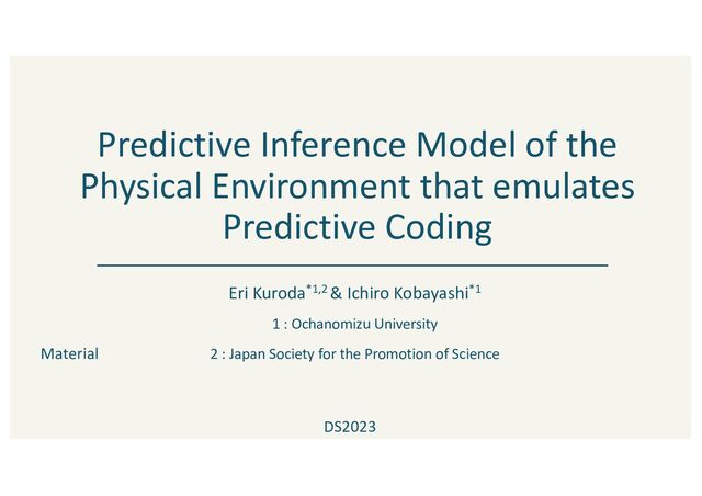 subject will do next and take action accordingly Ø learn how the world works and background knowledge from a few interactions and observations • change point, common sense • Understanding the real world through language Ø have linguistic information such as common sense and knowledge Ø gain a deeper understanding of the real world by connecting language to the real world Real World Cognition of Humans BUT… • Machine learning for real-world recognition prediction Ø input (observation) is an image → equivalent to human vision Ø predictions of image features are considered real- world predictions • ML doesn't make predictions based on physical properties of objects or physical laws, as humans do • real world and understanding the real world through language have not yet been linked • proposes a predictive inference model that can detect and predict physical change points based on the physical laws of real-world objects. • To connect the real world and language, the inference is expressed as a language. Purpose