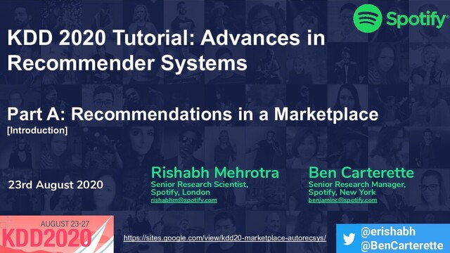 PhD in ML/IR from University College London • BE (Hons) Computer Science, MSc (Hons) Mathematics, BITS Pilani, India • Visiting researcher & intern, Microsoft Research, NYC/Redmond (2015-16) • Co-founder, UserContext.AI • Goldman Sachs Ben Carterette Sr Research Manager, Spotify, New York Past: • Associate Professor, University of Delaware (2008 onwards) • Visiting Researcher, CMU (2010) • Visiting Researcher, Yahoo Labs (2009) • PhD from University of Massachusetts Amherst (2008)