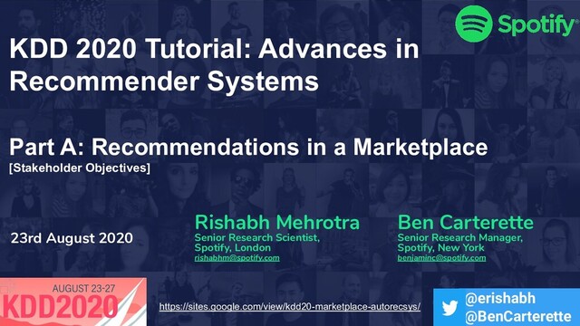 in a Marketplace [Stakeholder Objectives] Rishabh Mehrotra Ben Carterette Senior Research Scientist, Senior Research Manager, Spotify, London Spotify, New York [email protected] [email protected] 23rd August 2020 @erishabh @BenCarterette https://sites.google.com/view/kdd20-marketplace-autorecsys/
