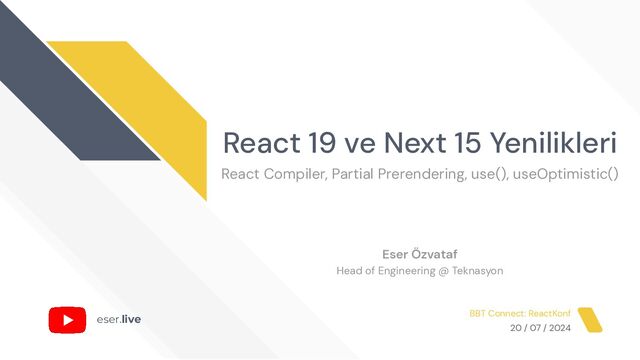 ettiği alanda ➔ React browser’ı merkezine alan bir Full Stack Web Framework olarak geliştirilmeye devam ediyor ➔ Eski mekanik/imperatif yaklaşımlar (useState/useEffect) yerine yeni yaklaşımlar geldi: use(), useActionState(), useOptimistic() Değerlendirme - Ne anlama geliyor?