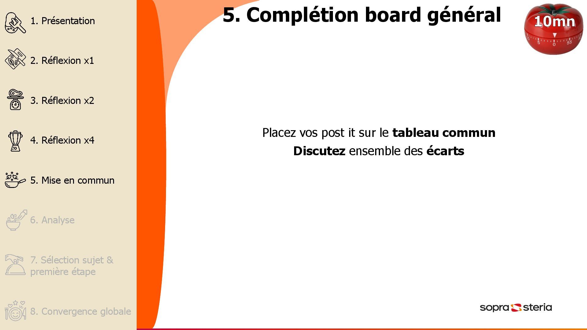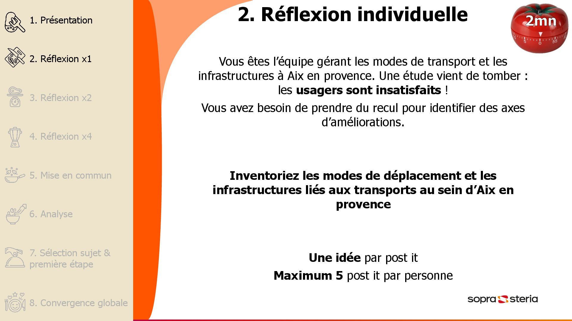 l’Ecocycle Planning - 5 min. 2. Chacun réfléchit à l’invitation et met une idée à la fois sur un post-it - 5 min. 3. En sous-groupe de 2, déterminer le positionnement des post-its (sans les placer) - 10 min. 4. En sous-groupe de 4, finaliser le positionnement des post- its, sur leur feuille d’ecocyle planning - 15 min. 5. Chaque groupe reporte leurs idées dans la représentation commune sur le mur, puis discutent des écarts – 15min. 6. En sous-groupe, discuter des consensus de placement et des pièges (Quelles activités devons-nous absolument supprimer ou arrêter pour pouvoir aller de l’avant ? Quelles activités devons-nous étendre pour progresser?) – 15min 7. En sous-groupes, pour chaque activité qui doit être arrêtée (Piège de rigidité), déterminer la première étape nécessaire - 10 min 8. En sous-groupes, pour chaque activité qui doit être démarrée (Piège de pauvreté), déterminer la première étape nécessaire - 10 min 9. Demander à tous les groupes de se concentrer sur toutes les activités pour lesquelles il n’y a aucun consensus. Quand cela est possible, déterminer la première étape pour traiter chacune de ces activités - 10 min. Objectif : analyser l’intégralité des activités et des rapports d’un groupe pour identifier les obstacles au progrès et les opportunités d’évolution. Exemples de cas d’utilisation : • Définir les priorités • Équilibrer un portefeuille stratégique • Identifier les gaspillages et les occasions de libérer des ressources 60 à 95mn