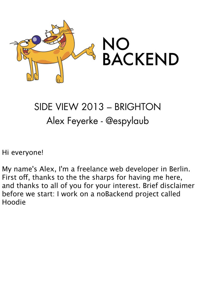 @espylaub Hi everyone! My name's Alex, I'm a freelance web developer in Berlin. First off, thanks to the the sharps for having me here, and thanks to all of you for your interest. Brief disclaimer before we start: I work on a noBackend project called Hoodie