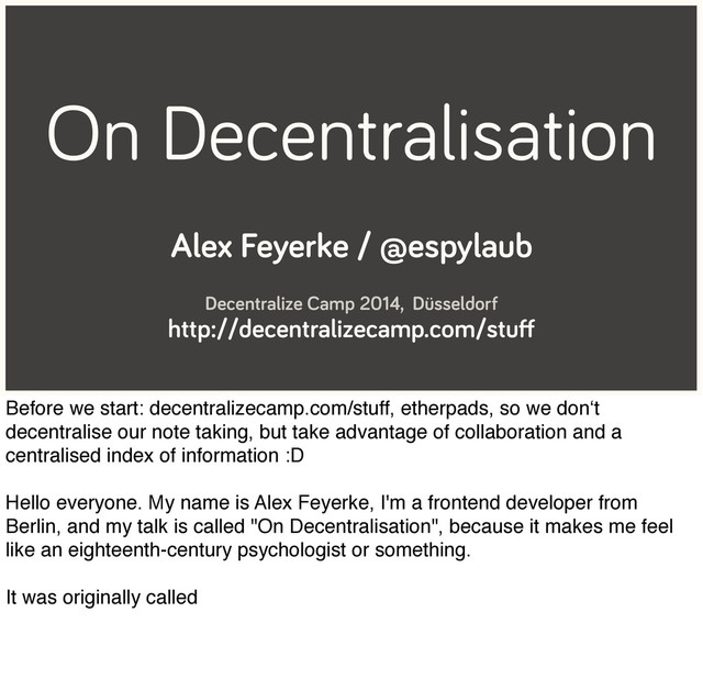 http://decentralizecamp.com/stuff Before we start: decentralizecamp.com/stuff, etherpads, so we don‘t decentralise our note taking, but take advantage of collaboration and a centralised index of information :D Hello everyone. My name is Alex Feyerke, I'm a frontend developer from Berlin, and my talk is called "On Decentralisation", because it makes me feel like an eighteenth-century psychologist or something. It was originally called