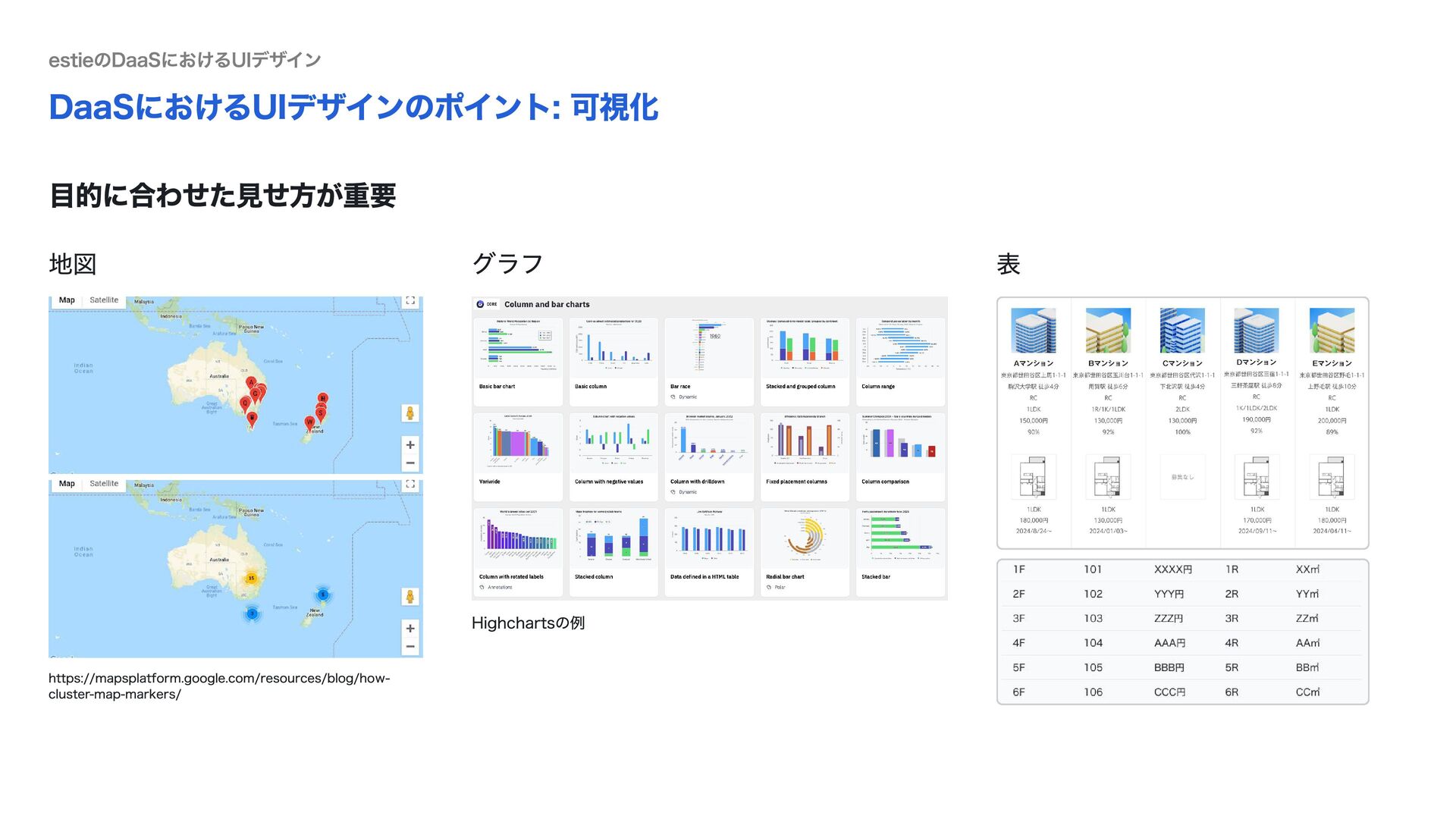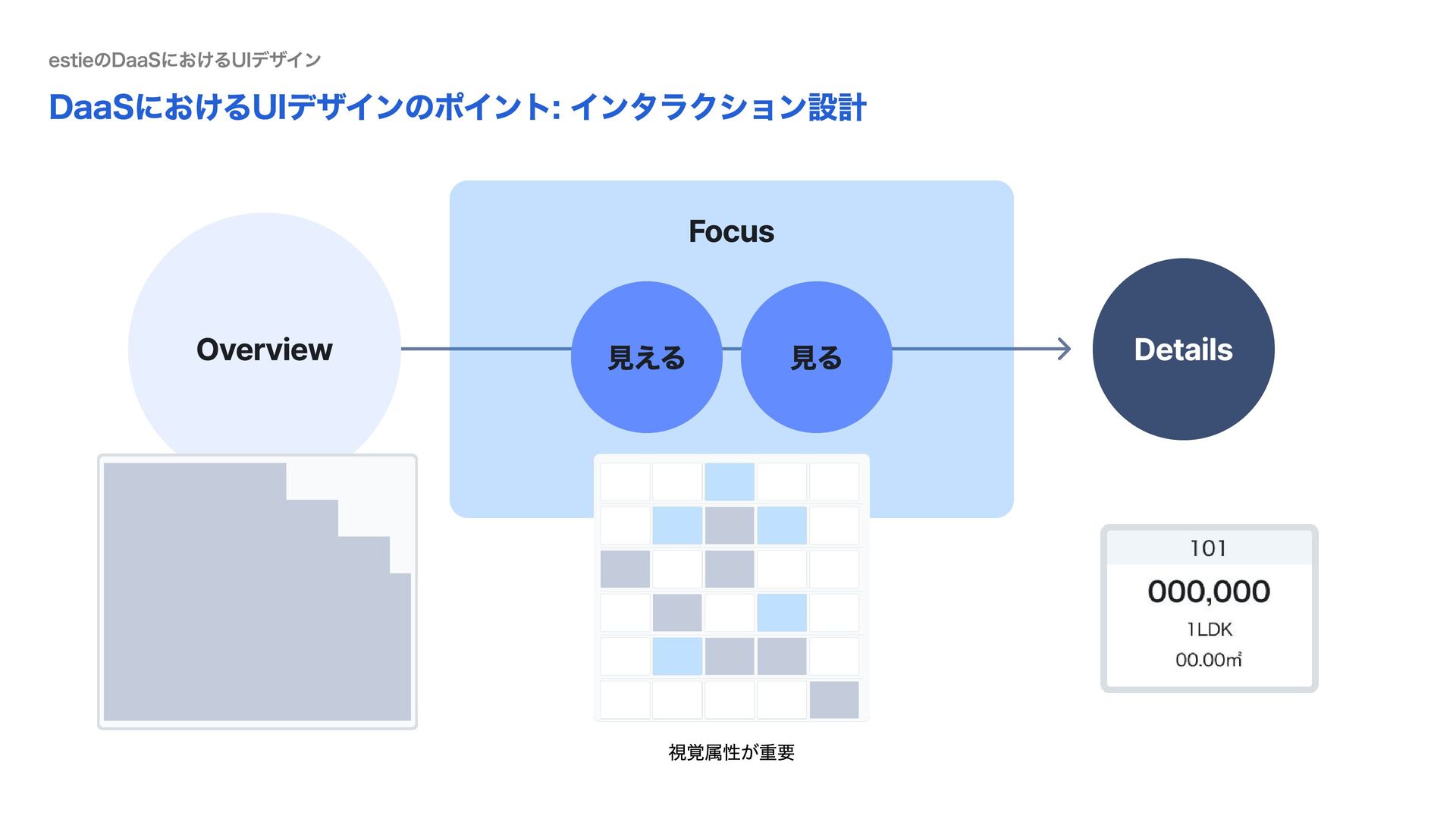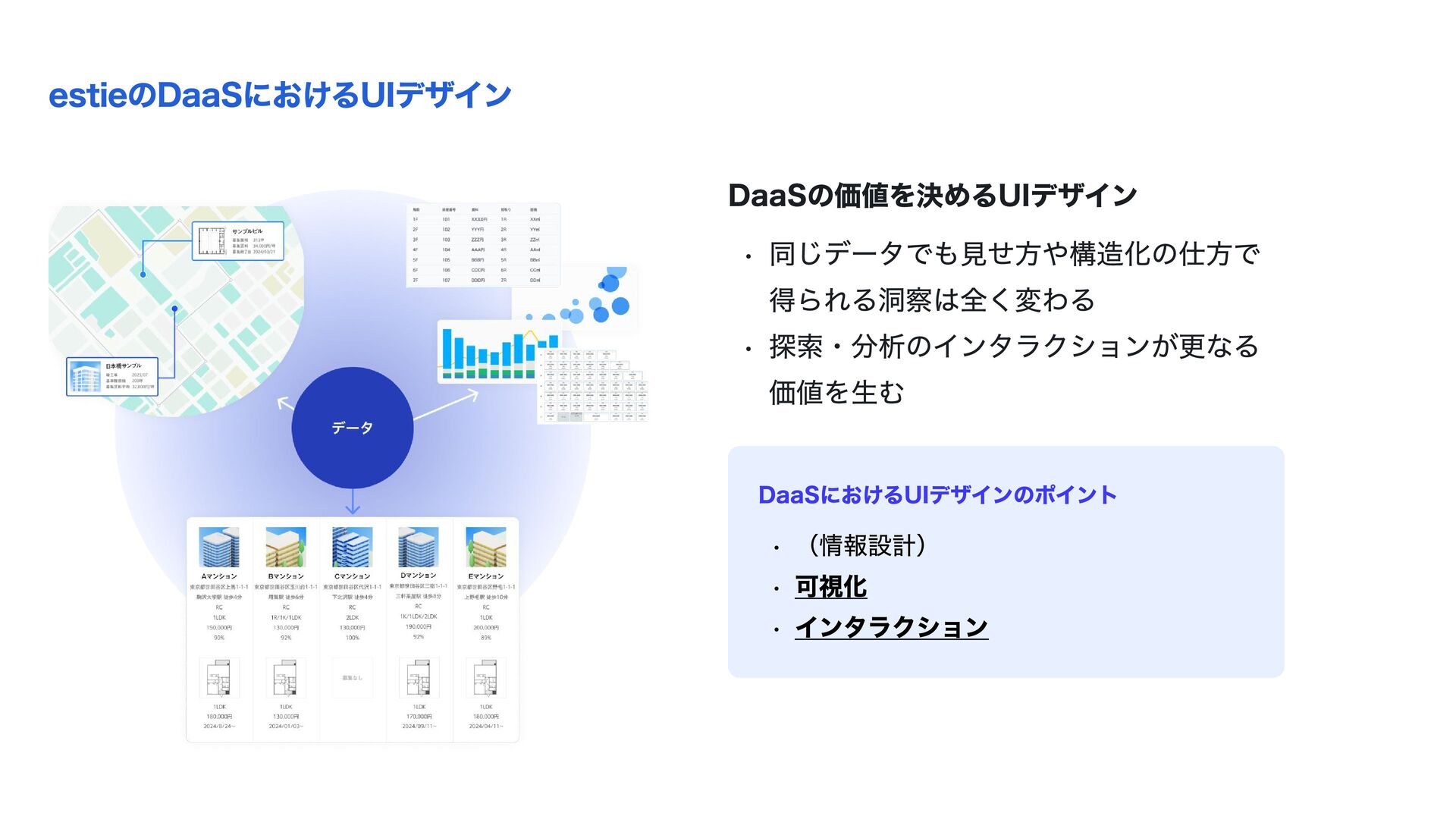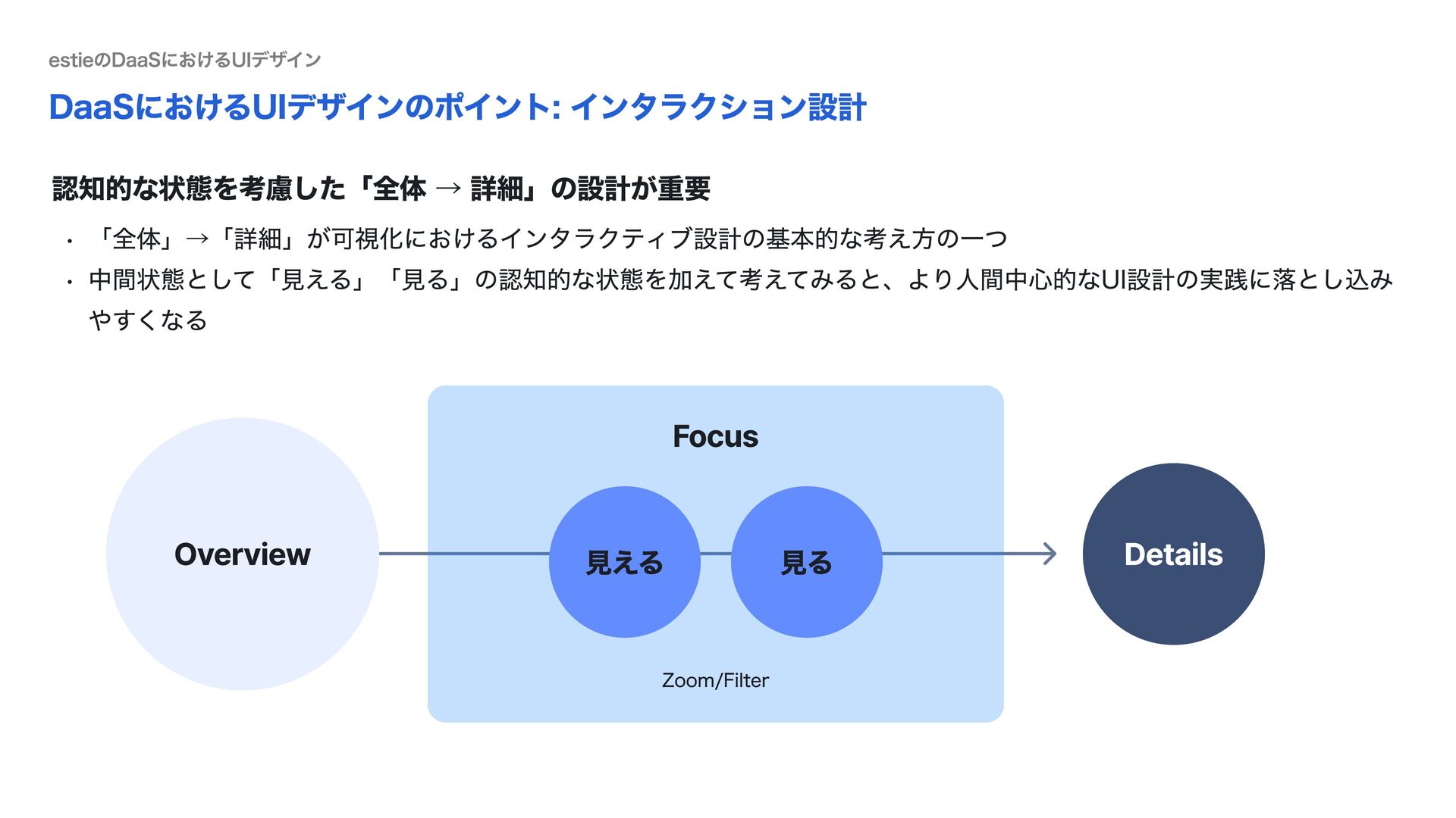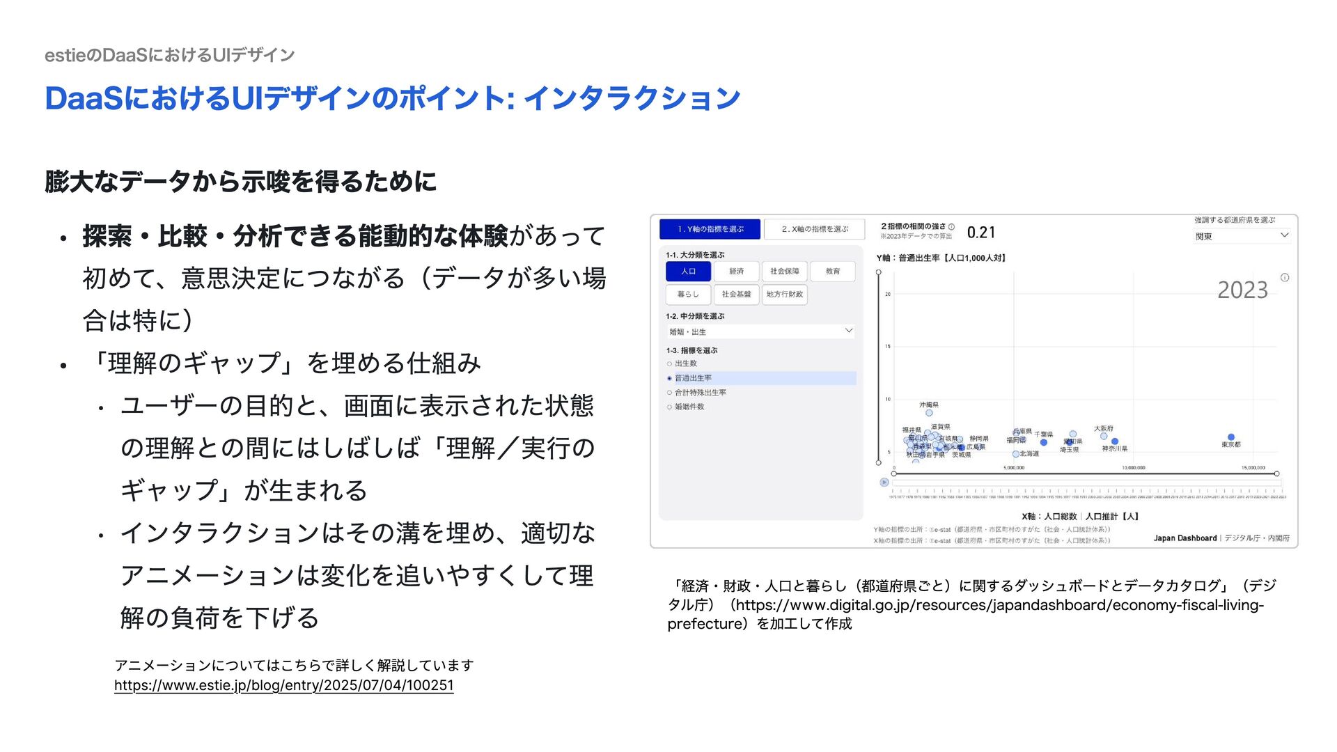 解の負荷を下げる アニメーションについてはこちらで詳しく解説しています https://www.estie.jp/blog/entry/2025/07/04/100251 「経済・財政・人口と暮らし(都道府県ごと)に関するダッシュボードとデータカタログ」(デジ タル庁)(https://www.digital.go.jp/resources/japandashboard/economy-fiscal-living- prefecture)を加工して作成 estieのDaaSにおけるUIデザイン DaaSにおけるUIデザインのポイント: インタラクション