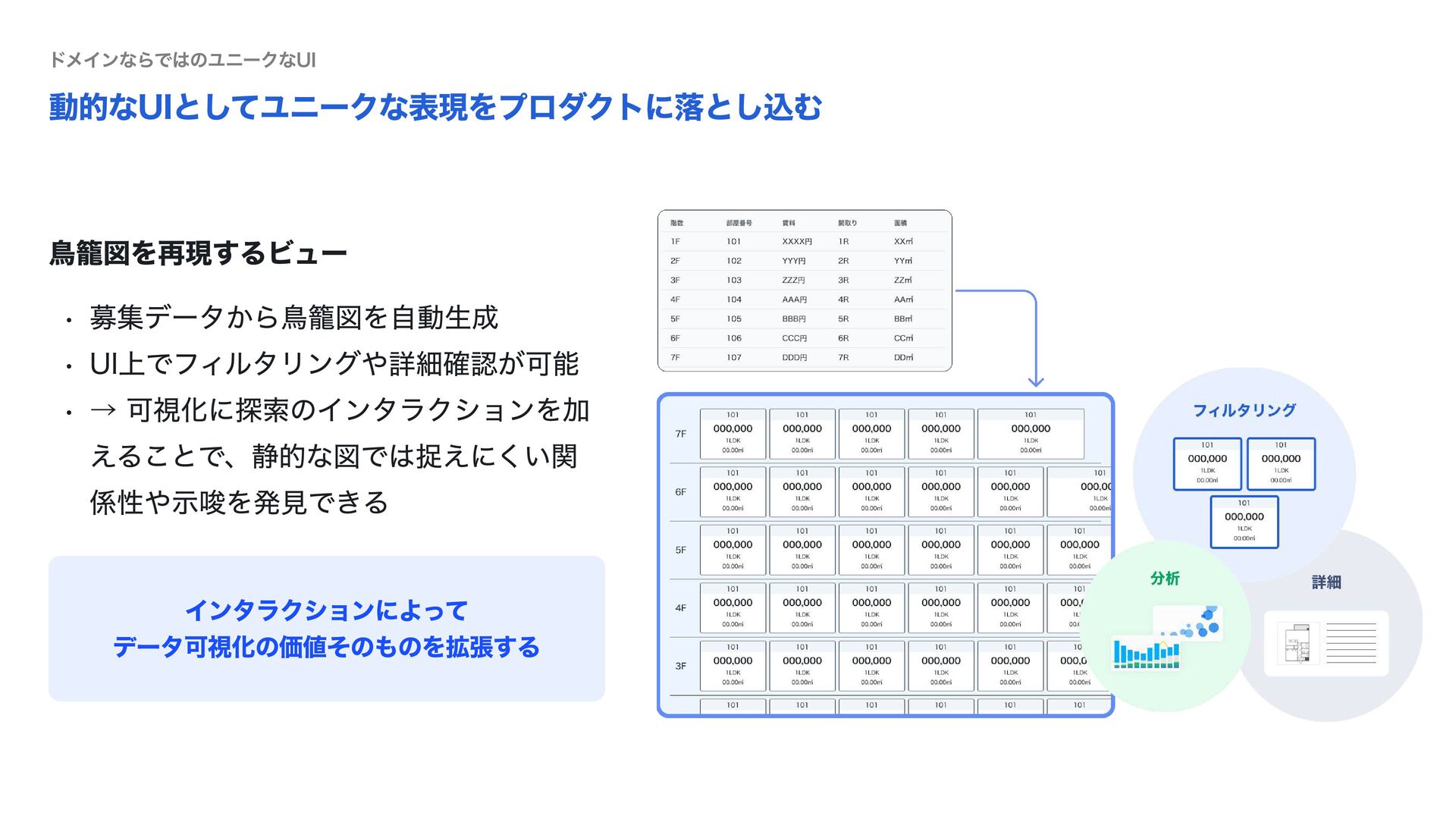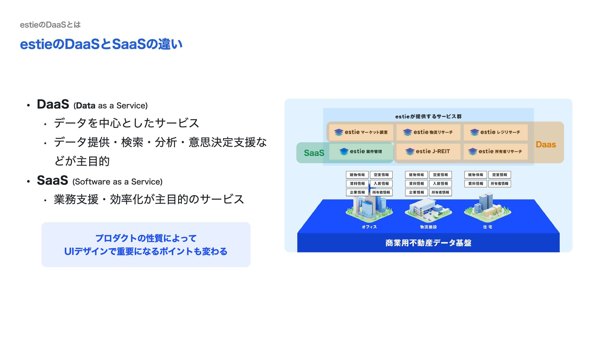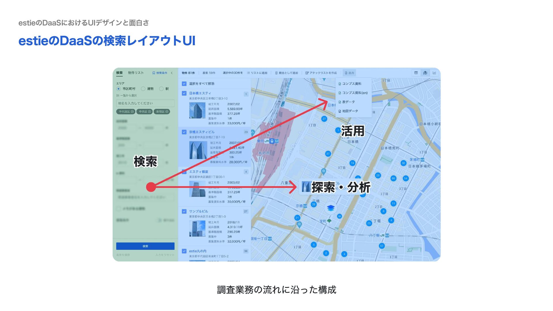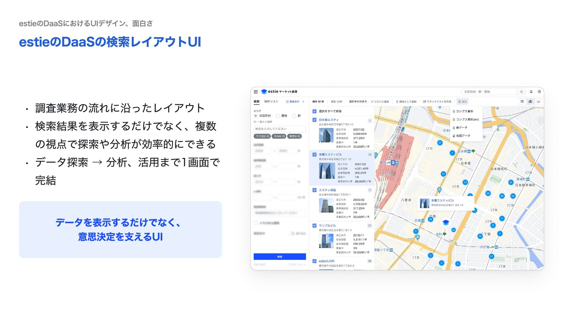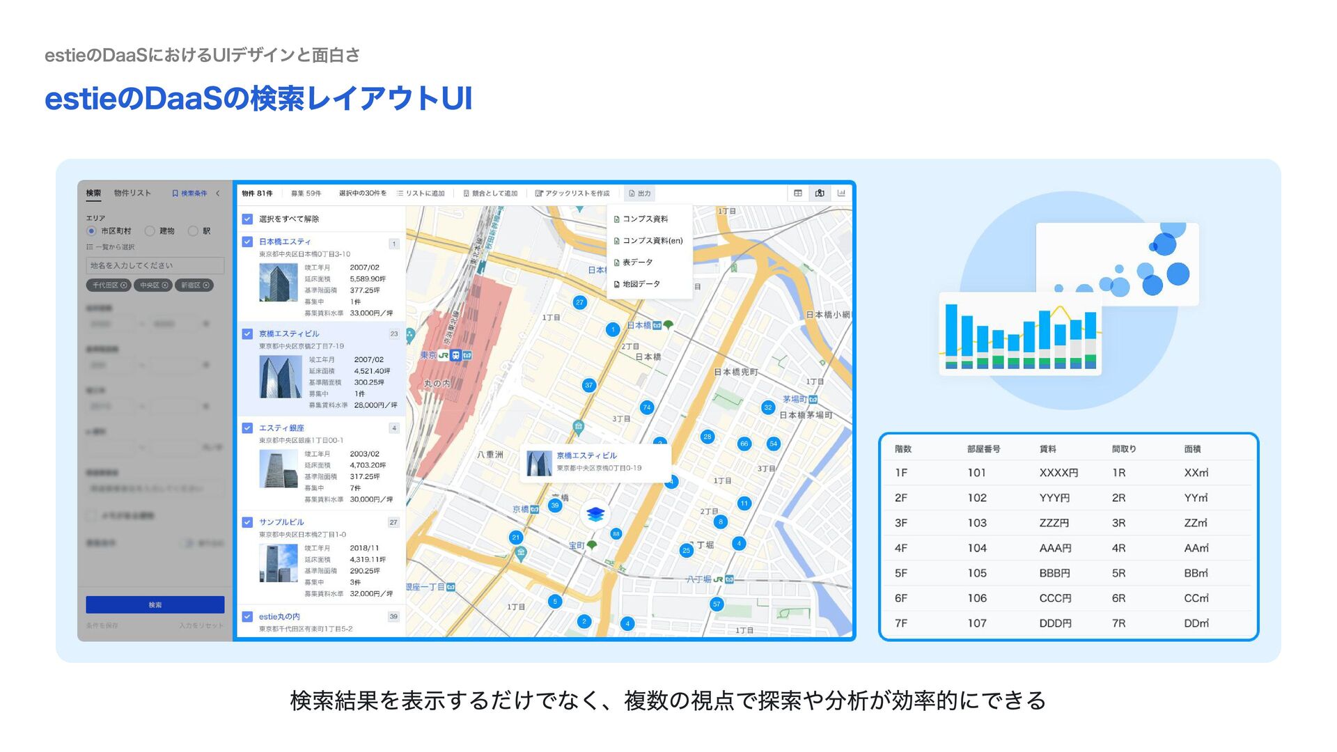 解の負荷を下げる アニメーションについてはこちらで詳しく解説しています https://www.estie.jp/blog/entry/2025/07/04/100251 「経済・財政・人口と暮らし(都道府県ごと)に関するダッシュボードとデータカタログ」(デジ タル庁)(https://www.digital.go.jp/resources/japandashboard/economy-fiscal-living- prefecture)を加工して作成 estieのDaaSにおけるUIデザイン DaaSにおけるUIデザインのポイント: インタラクション
