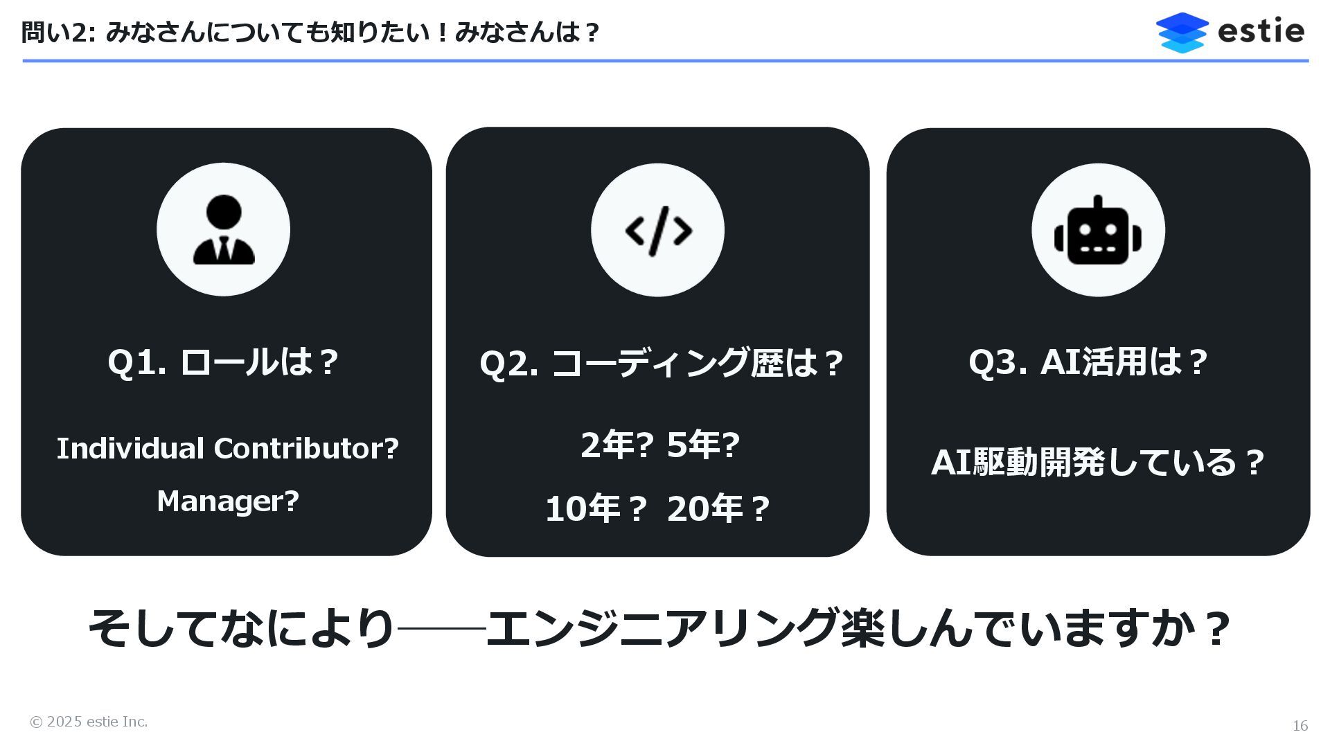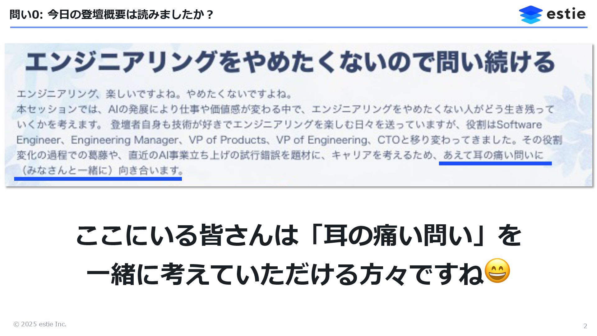 © 2025 estie Inc. ここにいる皆さんは「⽿の痛い問い」を ⼀緒に考えていただける⽅々ですね! 問い0: 今⽇の登壇概要は読みましたか︖ 2