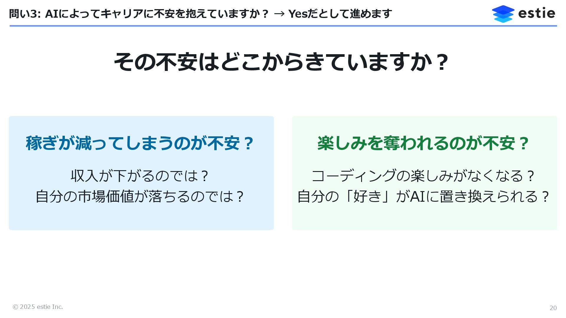 © 2025 estie Inc. 問い3: AIによってキャリアに不安を抱えていますか︖ → Yesだとして進めます 20 稼ぎが減ってしまうのが不安︖