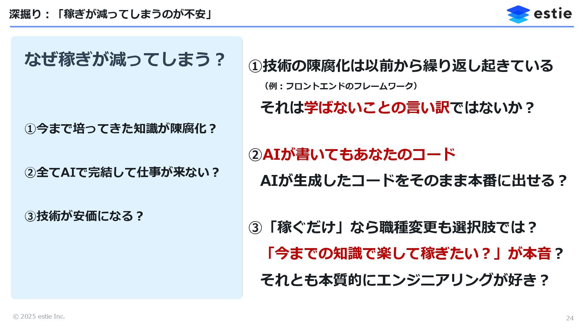 © 2025 estie Inc. 深掘り︓「稼ぎが減ってしまうのが不安」 24 なぜ稼ぎが減ってしまう︖ ①今まで培ってきた知識が陳腐化︖ ②全てAIで完結して仕事が来ない︖ ③技術が安価になる︖