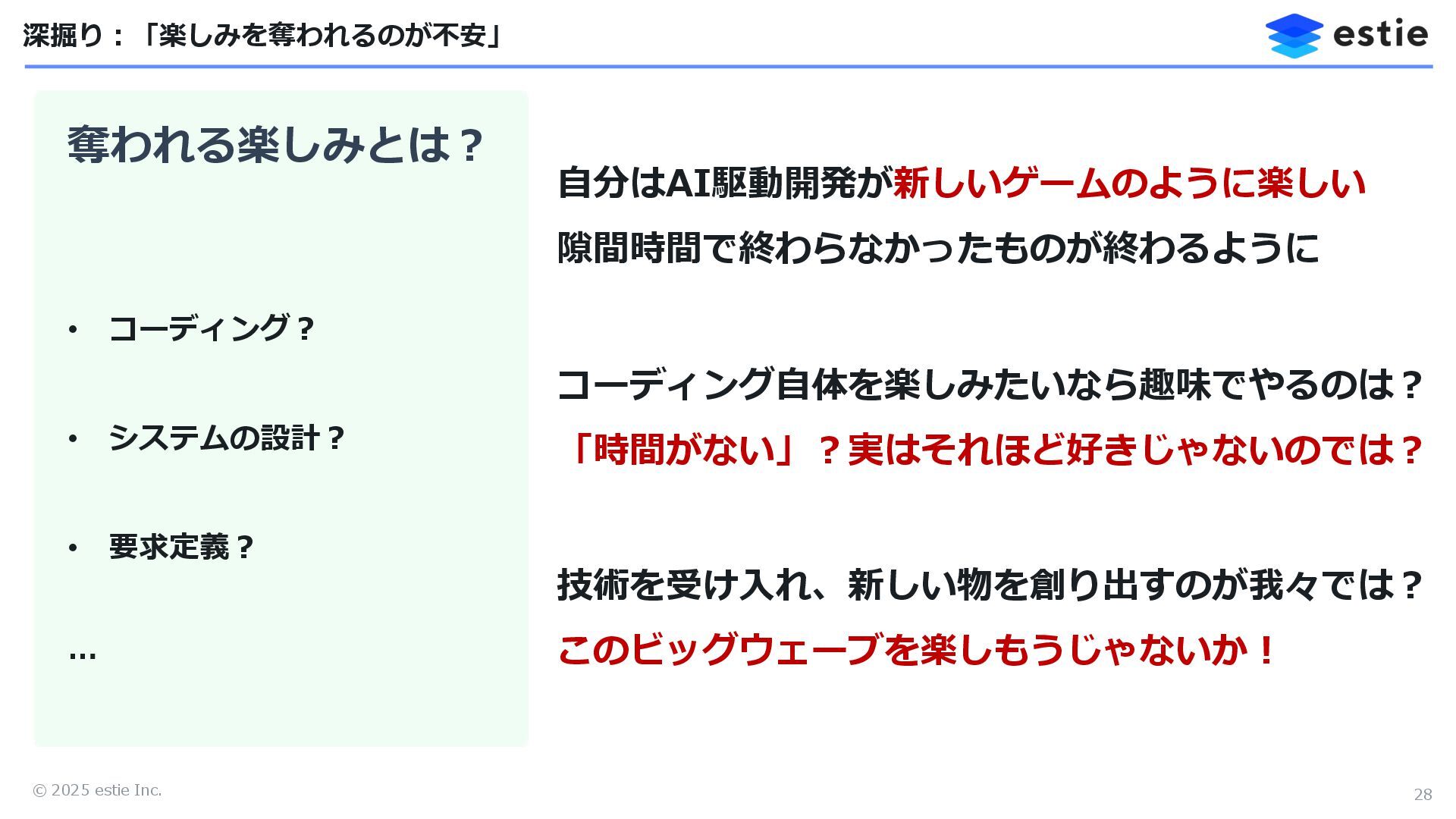 © 2025 estie Inc. 深掘り︓「楽しみを奪われるのが不安」 28 ⾃分はAI駆動開発が新しいゲームのように楽しい 隙間時間で終わらなかったものが終わるように コーディング⾃体を楽しみたいなら趣味でやるのは︖ 「時間がない」︖実はそれほど好きじゃないのでは︖