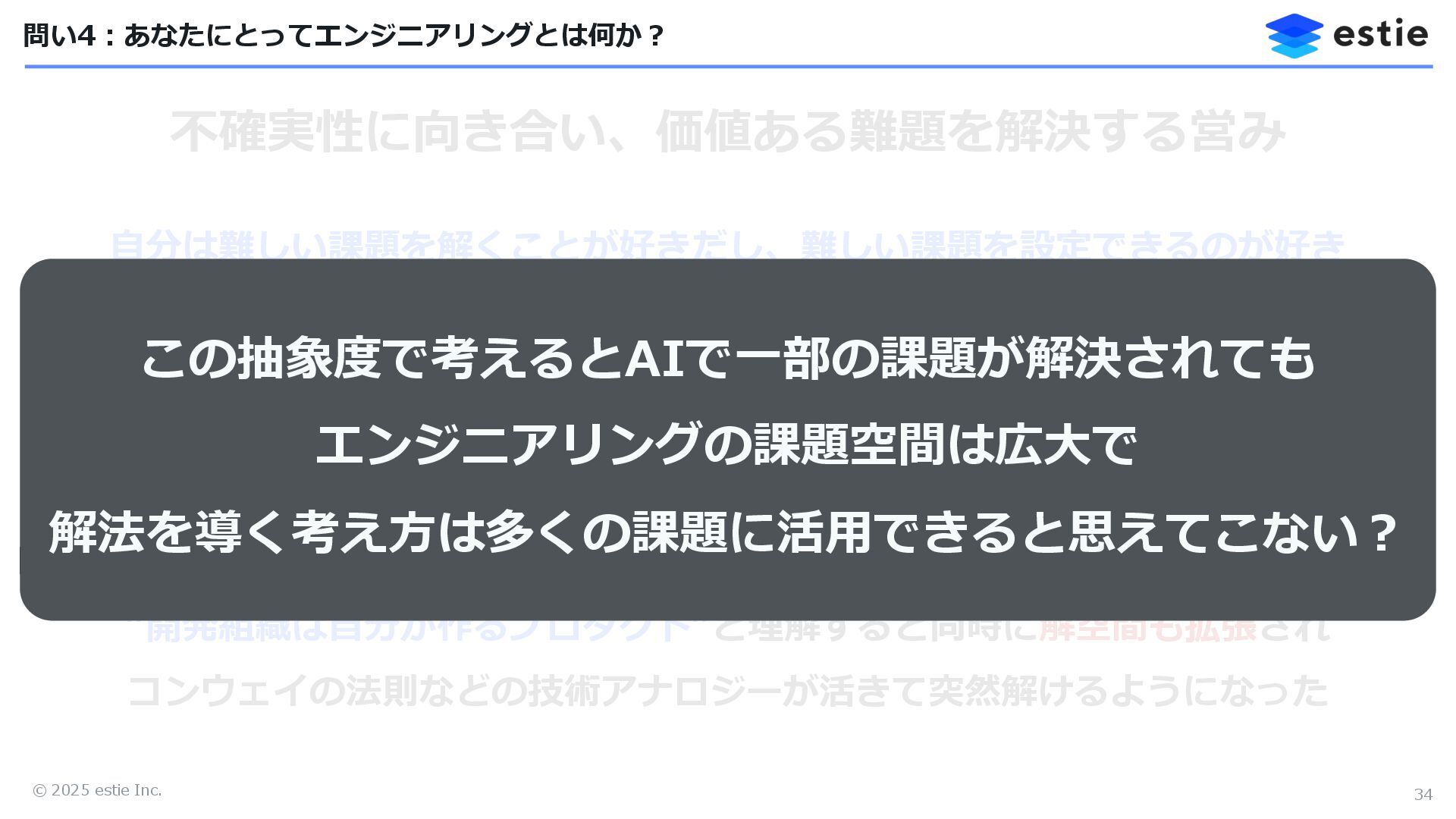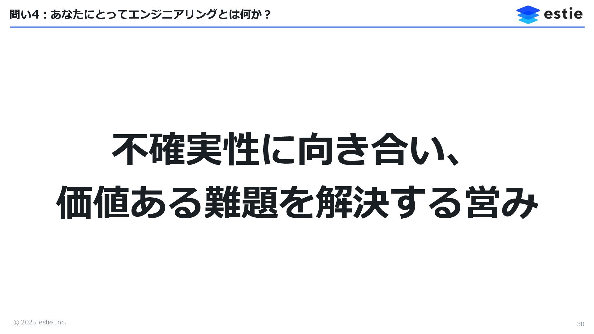 © 2025 estie Inc. 問い4︓あなたにとってエンジニアリングとは何か︖ 30 不確実性に向き合い、 価値ある難題を解決する営み
