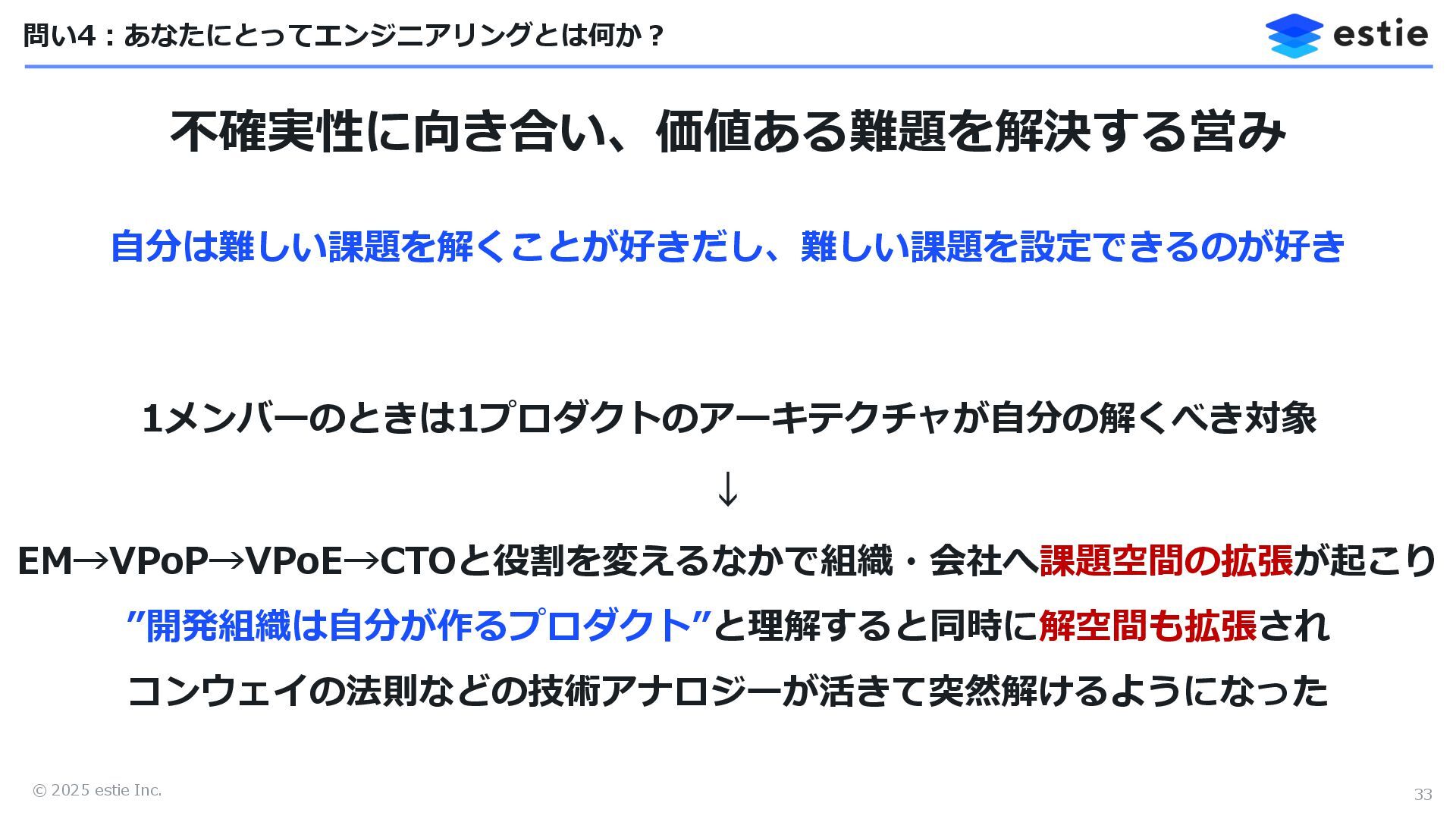 © 2025 estie Inc. 不確実性に向き合い、価値ある難題を解決する営み ⾃分は難しい課題を解くことが好きだし、難しい課題を設定できるのが好き 1メンバーのときは1プロダクトのアーキテクチャが⾃分の解くべき対象 ↓ EM→VPoP→VPoE→CTOと役割を変えるなかで組織・会社へ課題空間の拡張が起こり ”開発組織は⾃分が作るプロダクト”と理解すると同時に解空間も拡張され