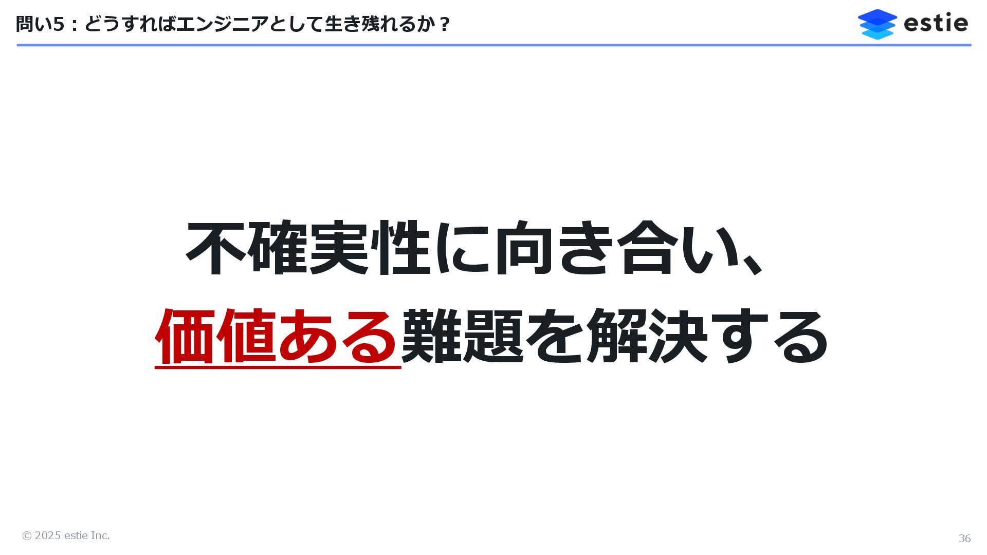 © 2025 estie Inc. 不確実性に向き合い、 価値ある難題を解決する 問い5︓どうすればエンジニアとして⽣き残れるか︖ 36