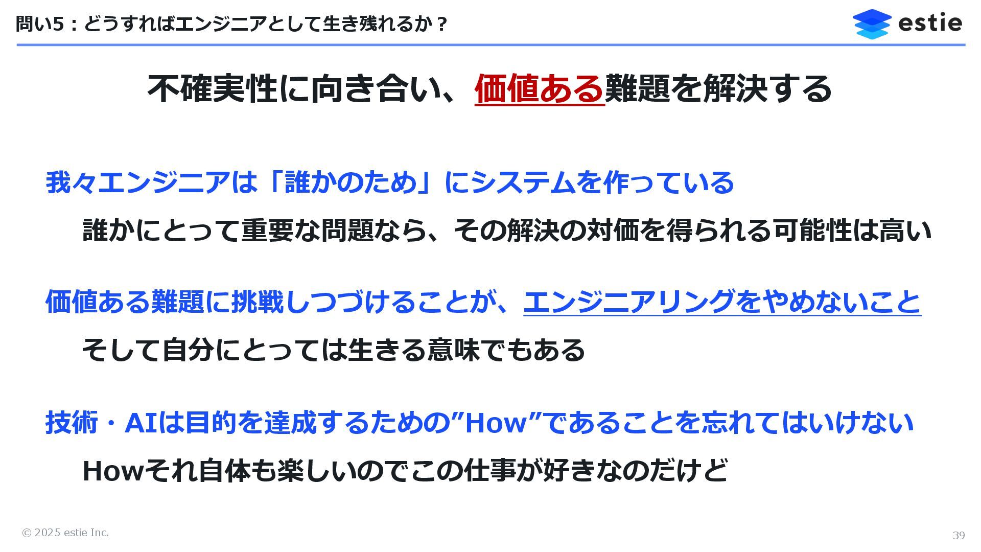 © 2025 estie Inc. 問い5︓どうすればエンジニアとして⽣き残れるか︖ 39 不確実性に向き合い、価値ある難題を解決する 我々エンジニアは「誰かのため」にシステムを作っている 誰かにとって重要な問題なら、その解決の対価を得られる可能性は⾼い 価値ある難題に挑戦しつづけることが、エンジニアリングをやめないこと