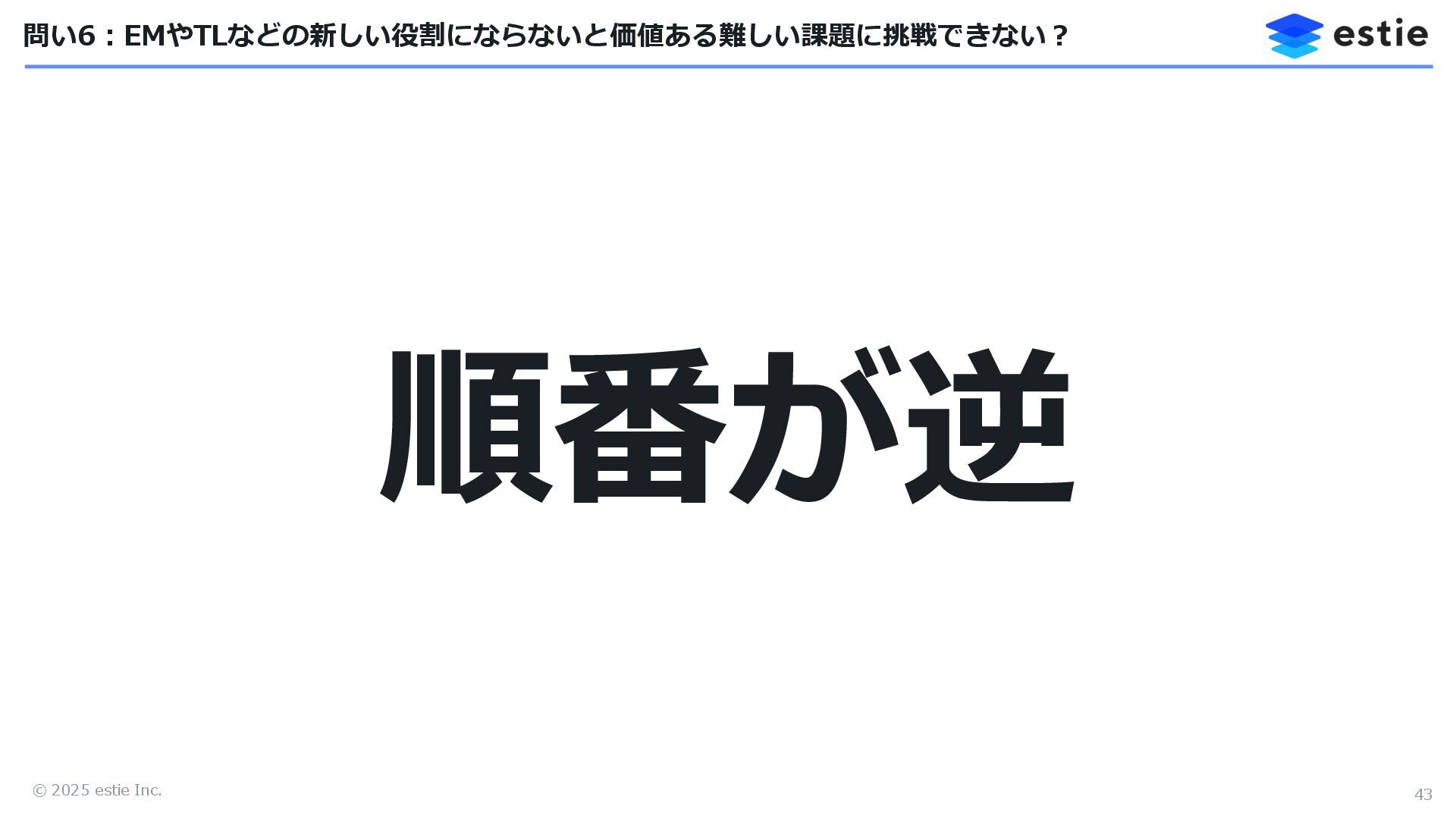 © 2025 estie Inc. 順番が逆 問い6︓EMやTLなどの新しい役割にならないと価値ある難しい課題に挑戦できない︖ 43