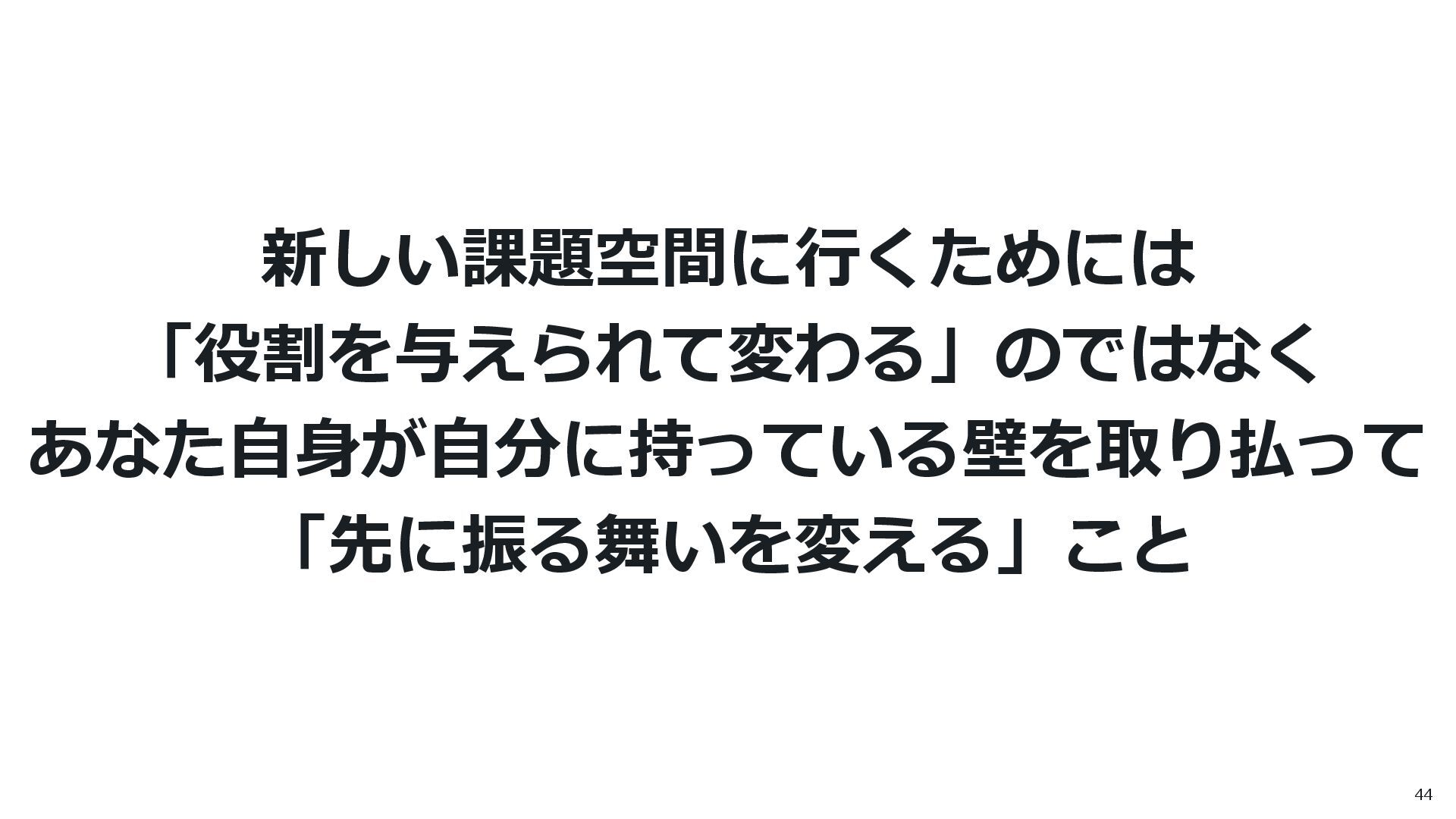 © 2025 estie Inc. 44 新しい課題空間に⾏くためには 「役割を与えられて変わる」のではなく あなた⾃⾝が⾃分に持っている壁を取り払って 「先に振る舞いを変える」こと