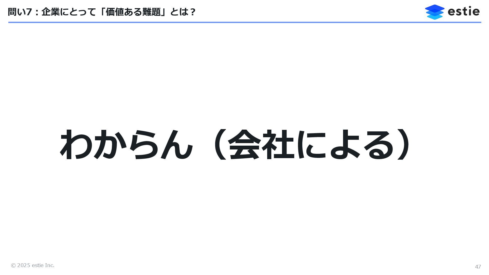 © 2025 estie Inc. わからん(会社による) 問い7︓企業にとって「価値ある難題」とは︖ 47
