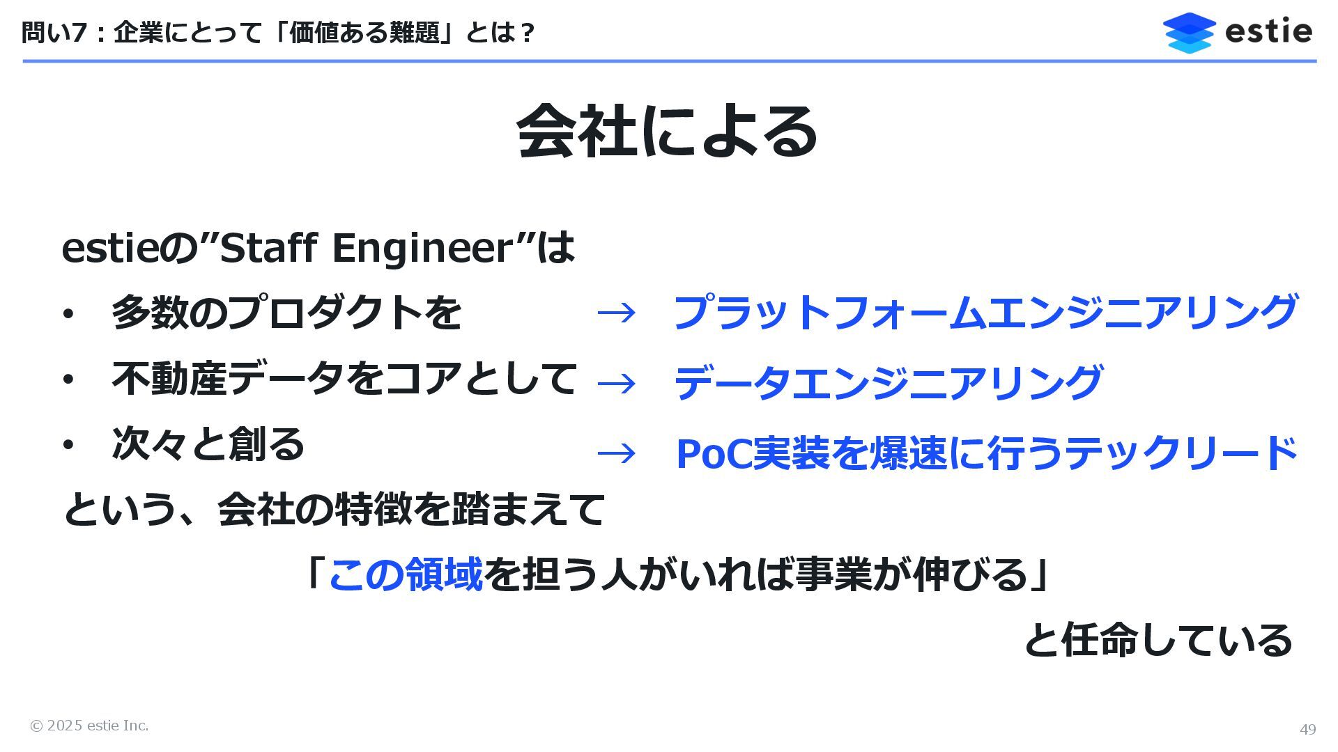 © 2025 estie Inc. 問い7︓企業にとって「価値ある難題」とは︖ 49 estieの”Staff Engineer”は • 多数のプロダクトを