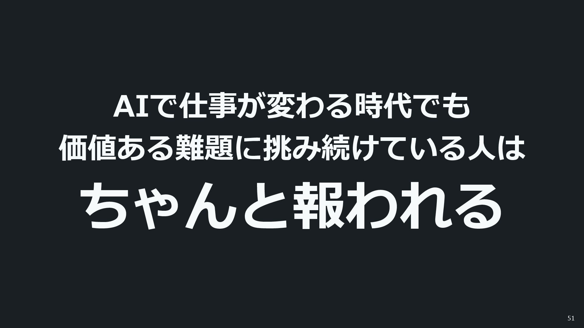 ①技術の陳腐化は以前から繰り返し起きている (例︓フロントエンドのフレームワーク) それは学ばないことの⾔い訳ではないか︖ ②AIが書いてもあなたのコード AIが⽣成したコードをそのまま本番に出せる︖ ③「稼ぐだけ」なら職種変更も選択肢では︖ 「今までの知識で楽して稼ぎたい︖」が本⾳︖ それとも本質的にエンジニアリングが好き︖