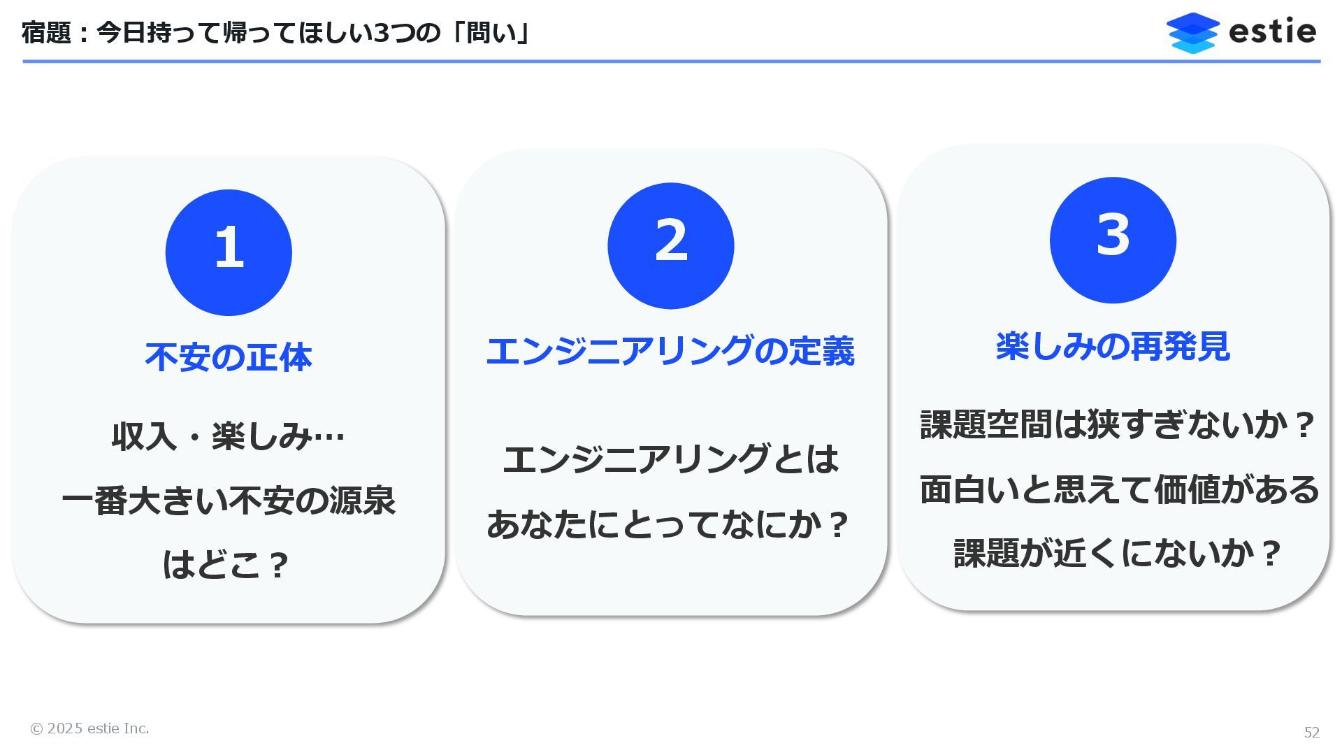 © 2025 estie Inc. 宿題︓今⽇持って帰ってほしい3つの「問い」 52 不安の正体 収⼊・楽しみ… ⼀番⼤きい不安の源泉 はどこ︖