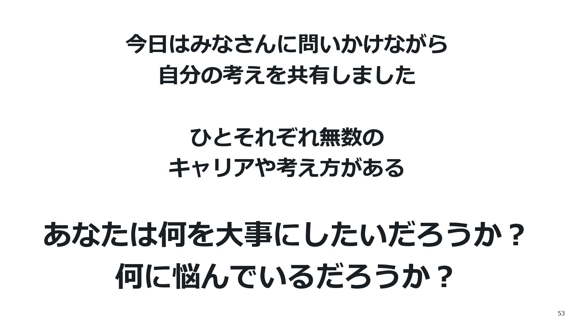 © 2025 estie Inc. 53 今⽇はみなさんに問いかけながら ⾃分の考えを共有しました ひとそれぞれ無数の キャリアや考え⽅がある あなたは何を⼤事にしたいだろうか︖