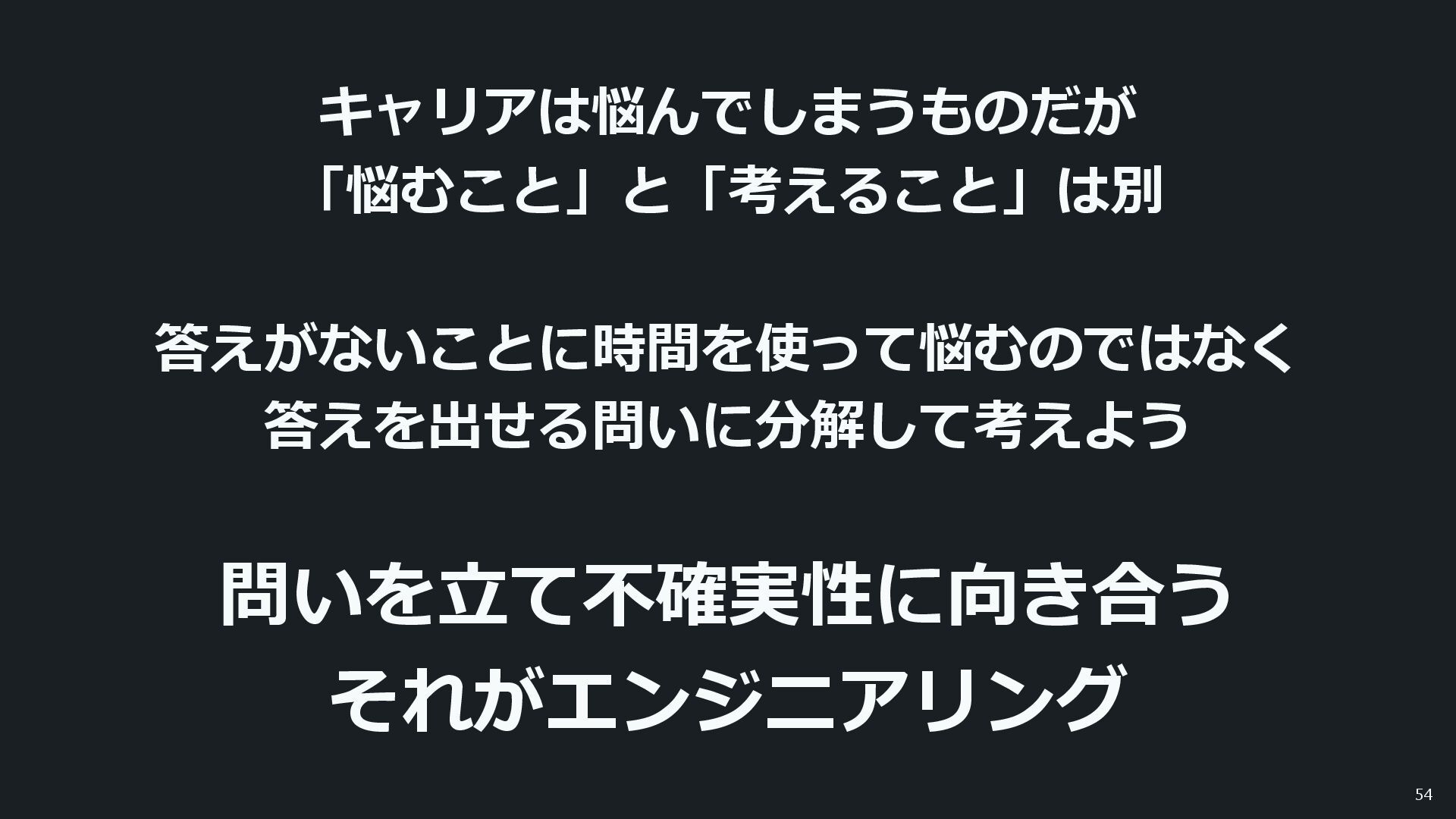 © 2025 estie Inc. 54 キャリアは悩んでしまうものだが 「悩むこと」と「考えること」は別 答えがないことに時間を使って悩むのではなく 答えを出せる問いに分解して考えよう 問いを⽴て不確実性に向き合う