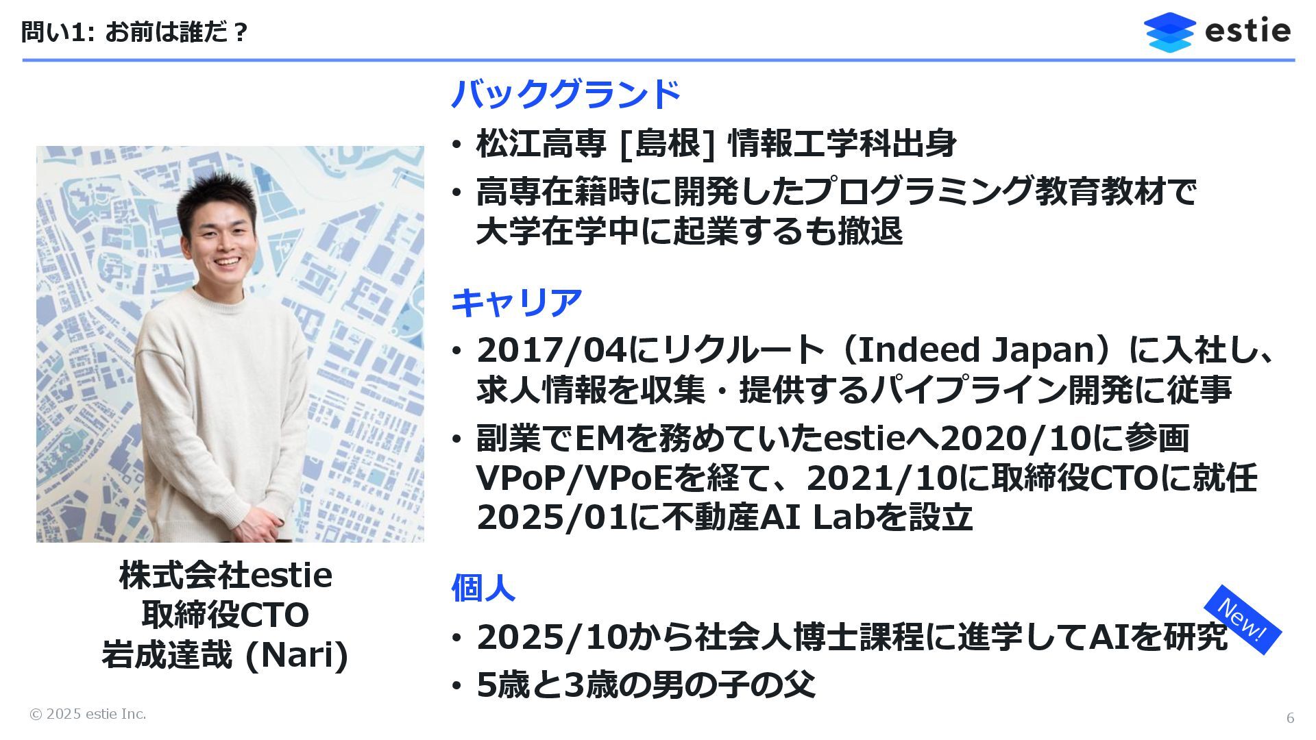 ⾼専在籍時に開発したプログラミング教育教材で ⼤学在学中に起業するも撤退 キャリア • 2017/04にリクルート(Indeed Japan)に⼊社し、 求⼈情報を収集・提供するパイプライン開発に従事 • 副業でEMを務めていたestieへ2020/10に参画 VPoP/VPoEを経て、2021/10に取締役CTOに就任 2025/01に不動産AI Labを設⽴ 個⼈ • 2025/10から社会⼈博⼠課程に進学してAIを研究 • 5歳と3歳の男の⼦の⽗ 問い1: お前は誰だ︖ 6 株式会社estie 取締役CTO 岩成達哉 (Nari) New !