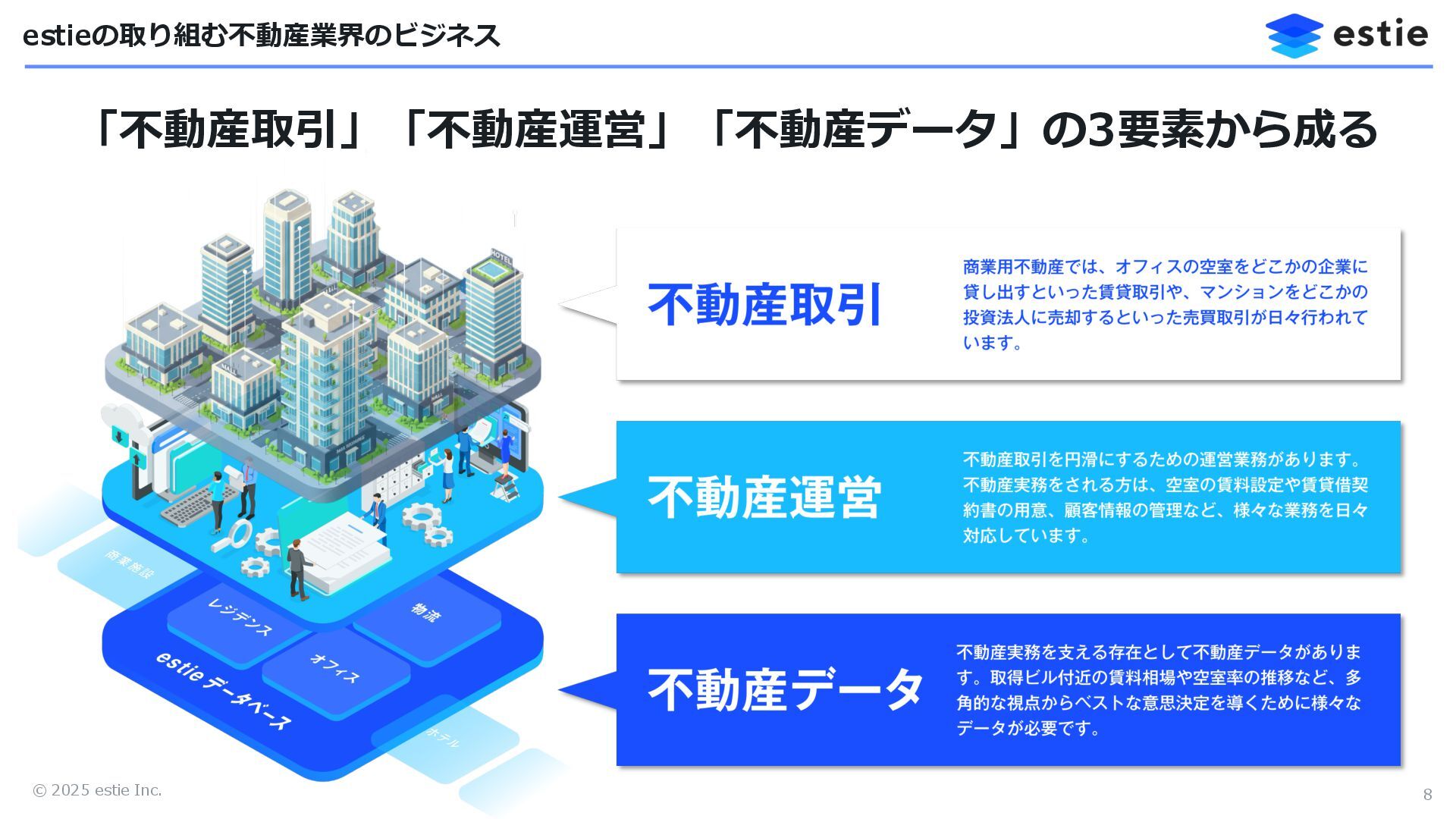 © 2025 estie Inc. 「不動産取引」「不動産運営」「不動産データ」の3要素から成る estieの取り組む不動産業界のビジネス 8