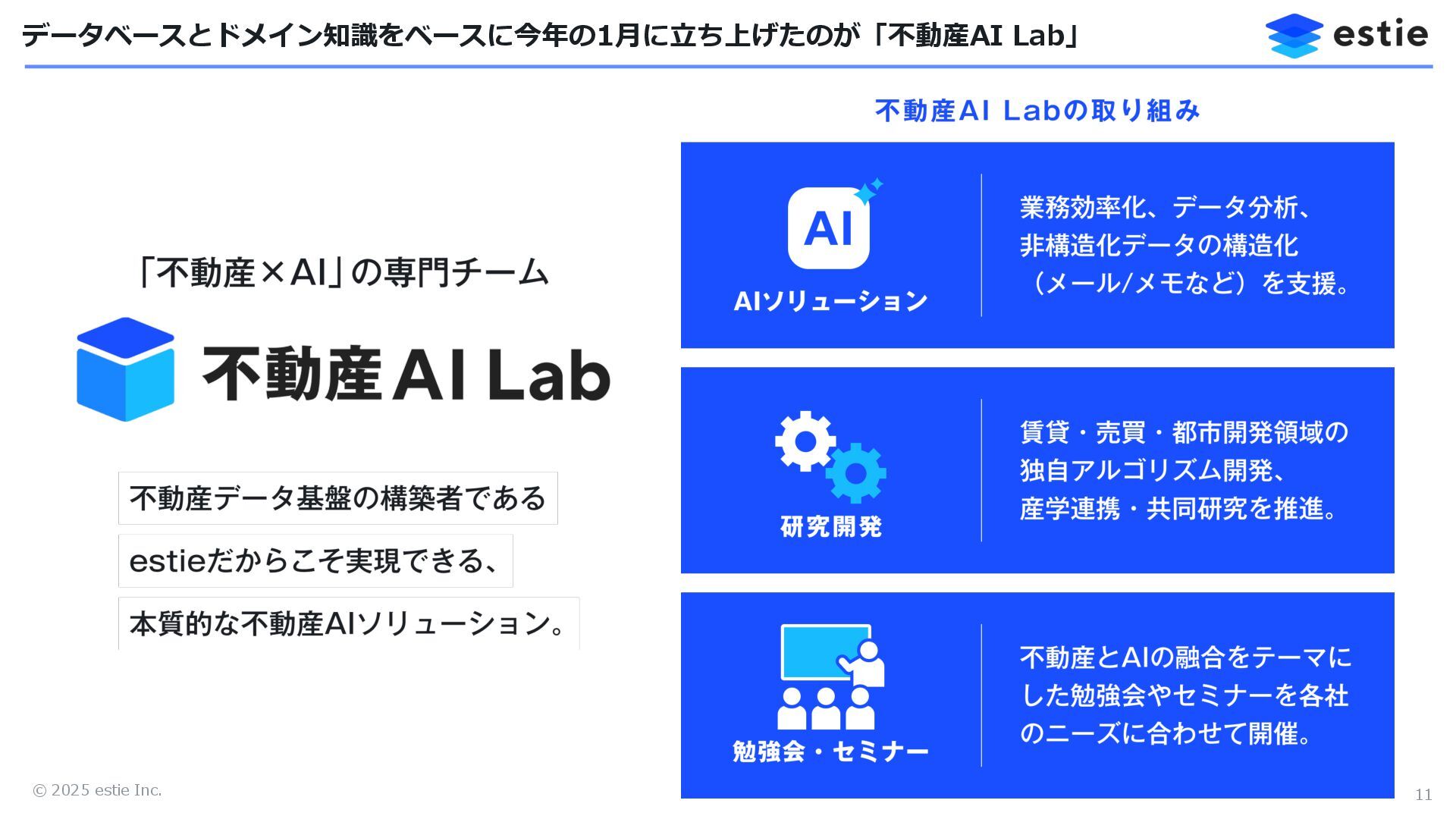 © 2025 estie Inc. データベースとドメイン知識をベースに今年の1⽉に⽴ち上げたのが「不動産AI Lab」 11