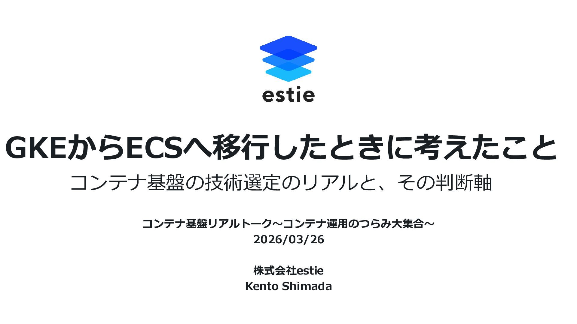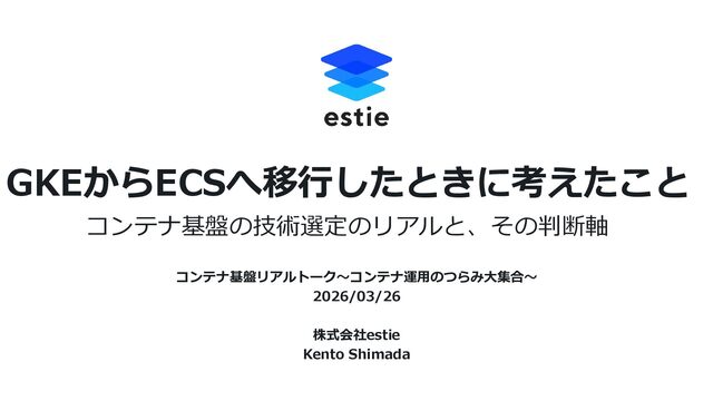 © estie Inc. GKEからECSへ移行したときに考えたこと コンテナ基盤の技術選定のリアルと、その判断軸 コンテナ基盤リアルトーク〜コンテナ運用のつらみ大集合〜 2026/03/26 株式会社estie Kento Shimada