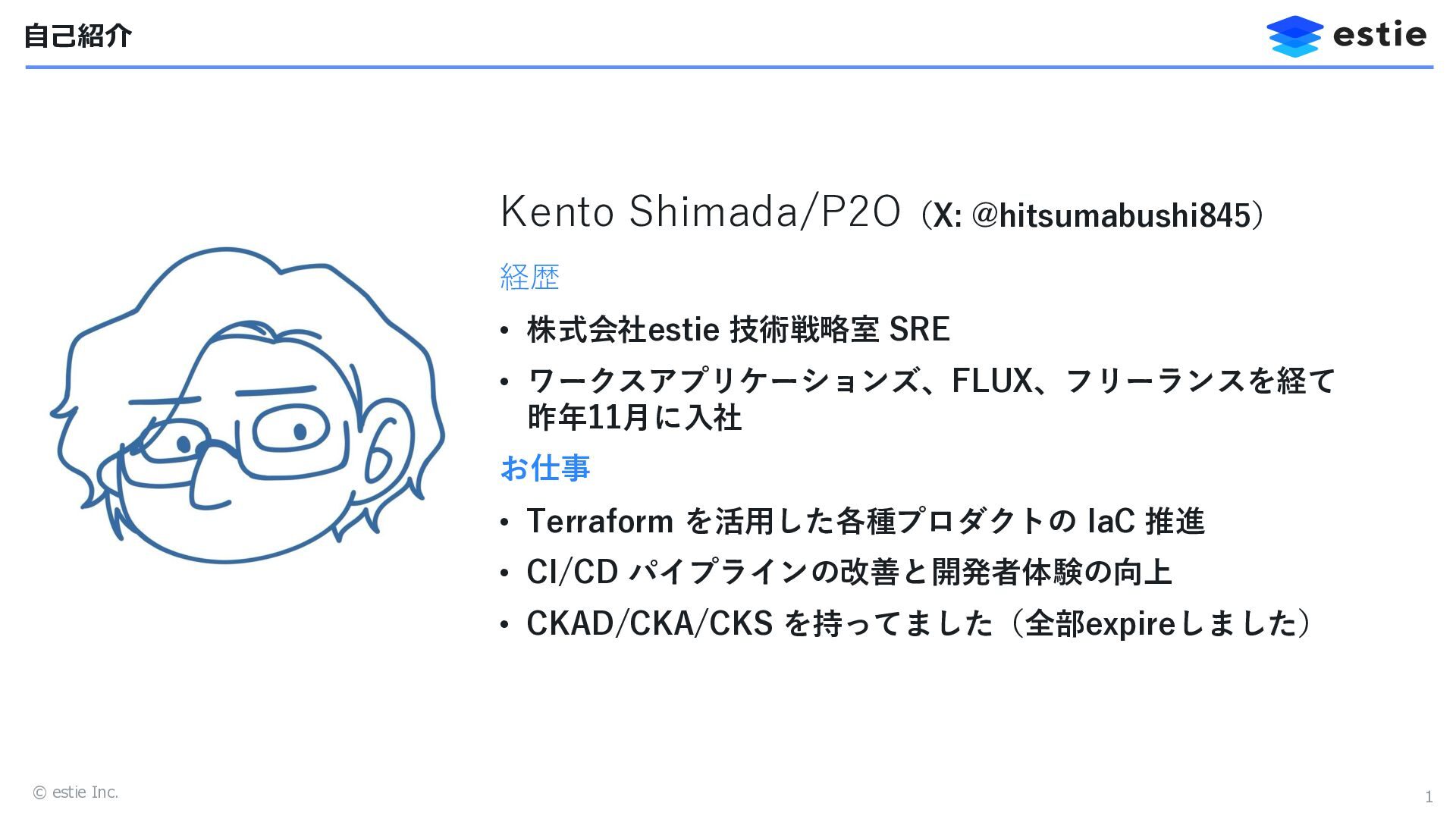 株式会社estie 技術戦略室 SRE • ワークスアプリケーションズ、FLUX、フリーランスを経て 昨年11月に入社 お仕事 • Terraform を活用した各種プロダクトの IaC 推進 • CI/CD パイプラインの改善と開発者体験の向上 • CKAD/CKA/CKS を持ってました(全部expireしました)